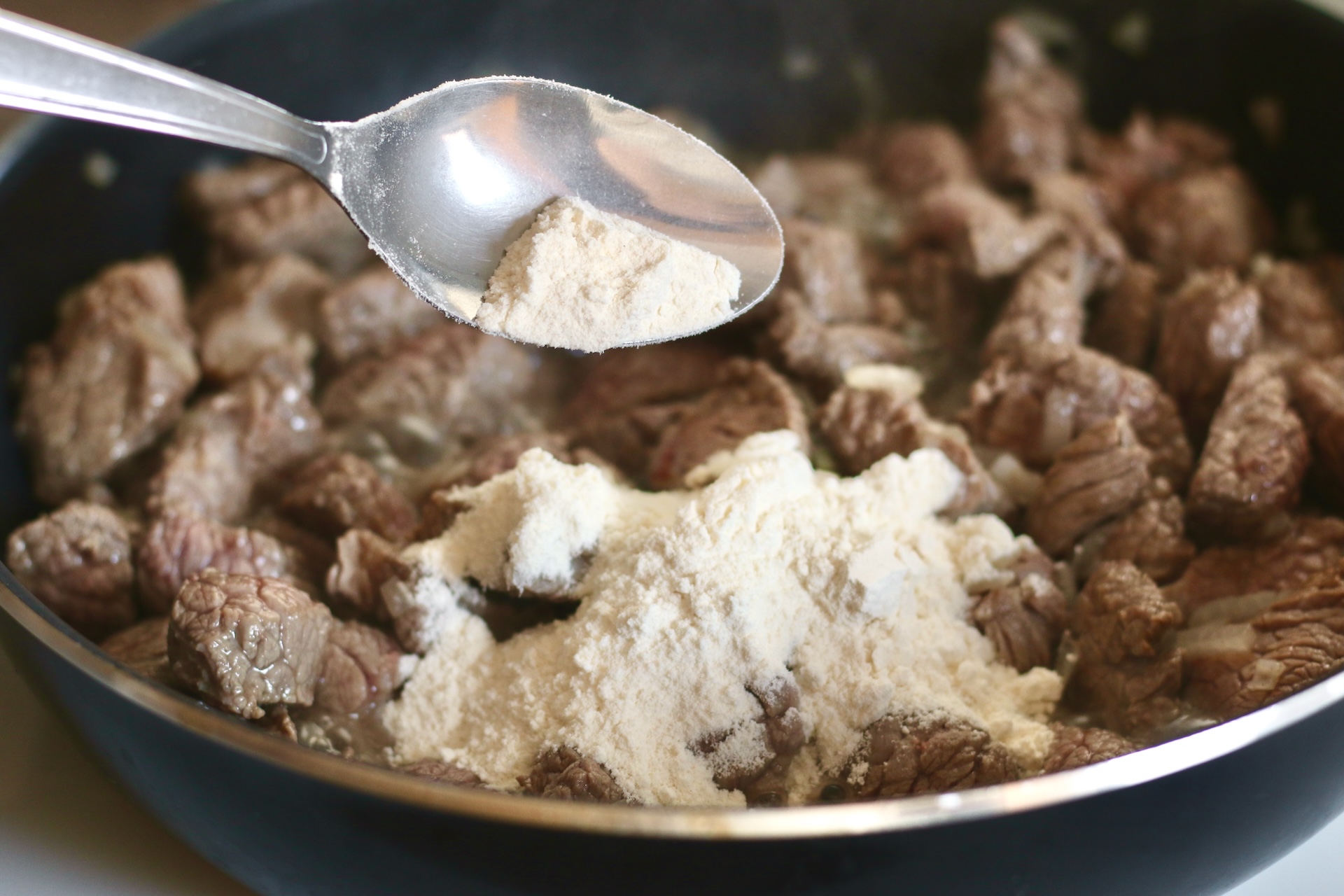 6. Всыпьте муку и снова перемешайте. Мука должна покрыть каждый кусочек. Обжарьте на сильном огне в течение пары минут.