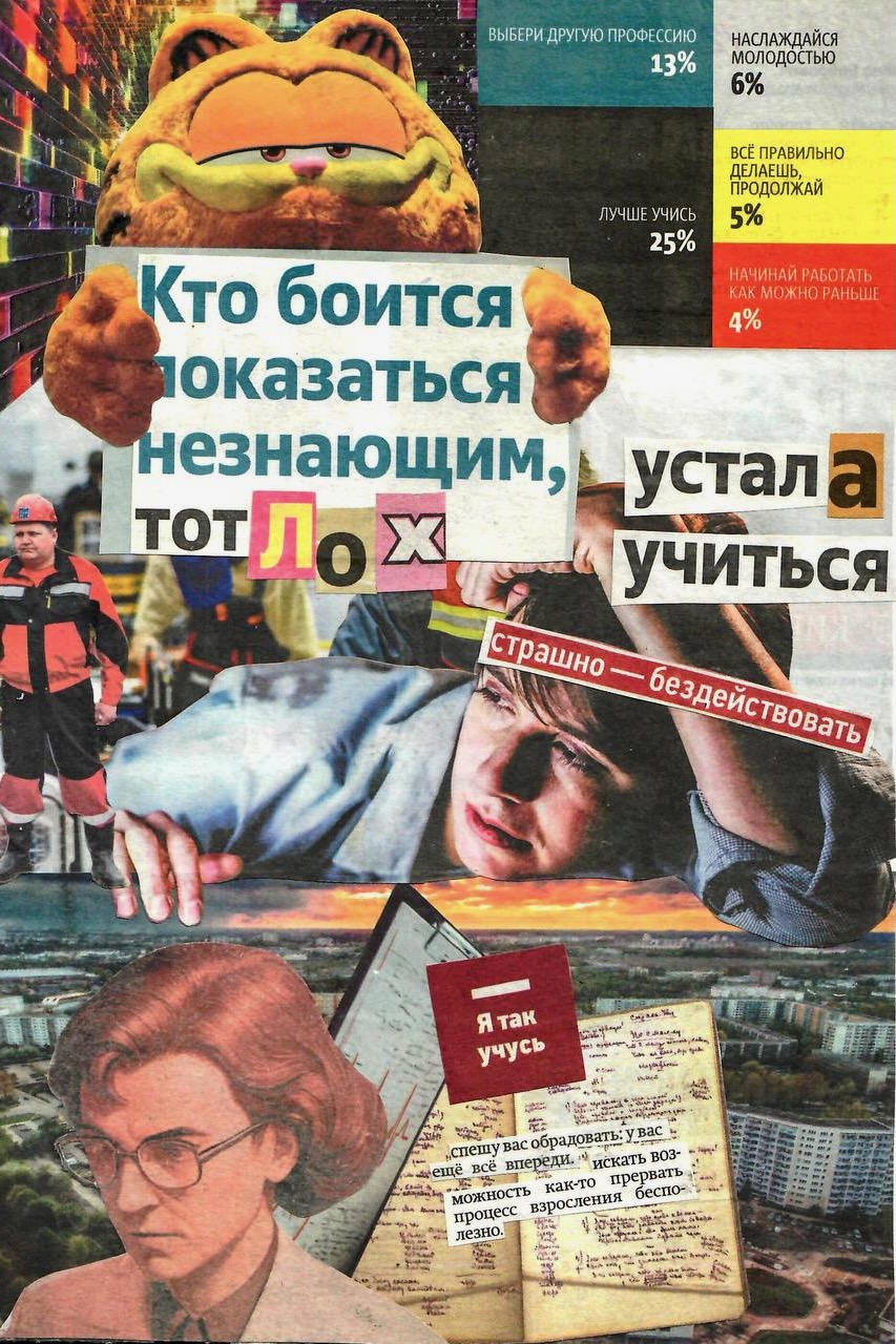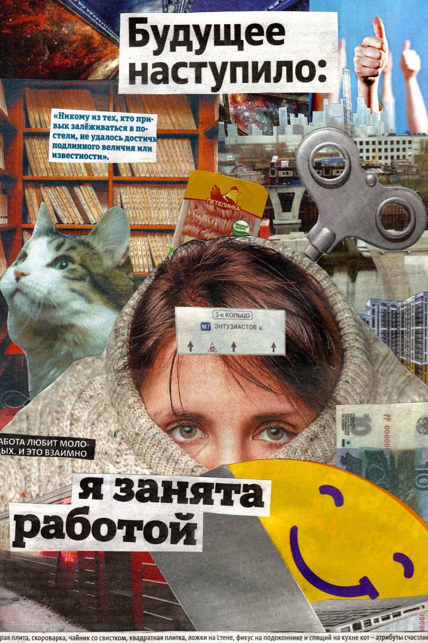 Мне нравится делать коллажи, которые можно долго разглядывать. Перенасыщенные, где все детали взяты из разных источников, но в итоге перекликаются и дают новые смыслы. Большинство моих коллажей — это слепок текущего состояния. Обычно это фрустрация или жалоба, в которых всегда есть место забавному и человеческому. Коллаж — «пост-пост-мета-мета»-жанр, где получается использовать повседневность, но не делать это пошло.