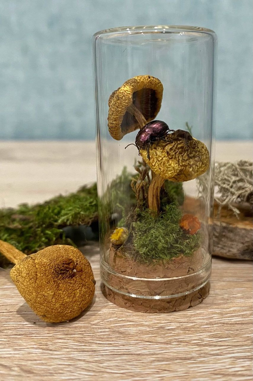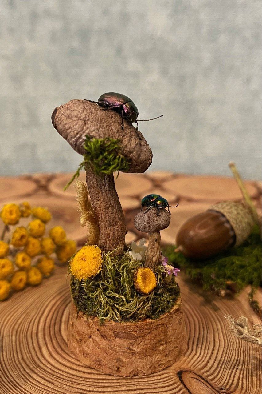 Мы вместе ходим по лесам и собираем материалы для будущих изделий: мох, грибы, лишайник, ягоды, веточки. Потом я делаю основу, представляю, как будет выглядеть тот или иной лесной уголок. Затем муж подбирает подходящих насекомышей и размещает их. Нам важно, чтобы всё выглядело как настоящий кусочек леса.