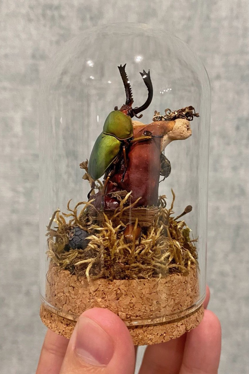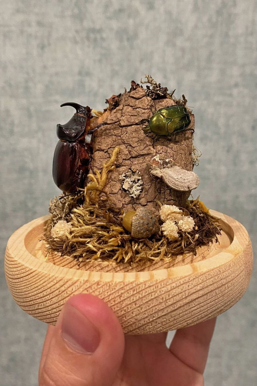 Пару лет назад я начала работать в магазине с товарами для рукоделия, где познакомилась со своим мужем. Он энтомолог — изучает и коллекционирует насекомых, и в этом магазине он выставлял различные композиции. Где-то на просторах интернета я увидела более сложные работы с лесными материалами и предложила делать что-то похожее. Так мы начали создавать миниатюры.