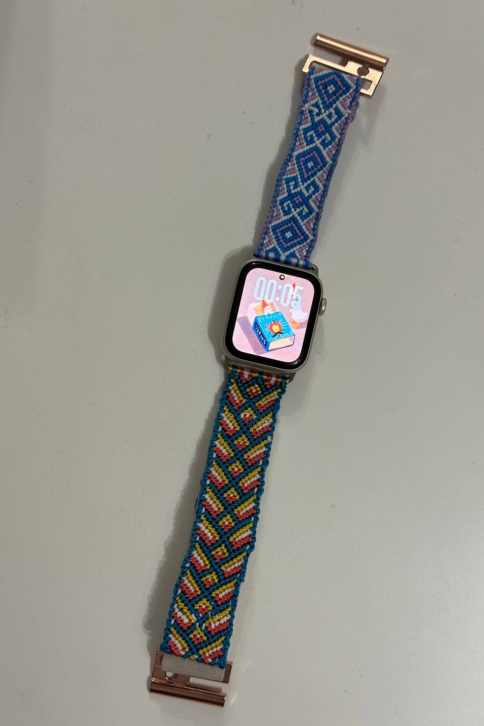 Этой весной подруга вдохновила меня на плетение ремешка для Apple Watch. Стандартные слишком короткие, чтобы носить часы на плече и не думать о них на волейболе. Так всё и началось. Я сплела ремешок себе, потом подруге. Увлеклась и сделала ещё несколько фенечек для близких.