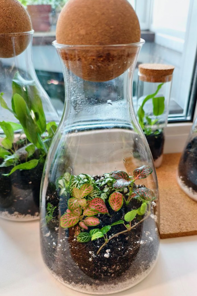 И это не просто «насыпал землю и посадил». Нужно продумать композицию, сочетание цветов и фактуры растений. Также важно заранее представить, как флорариум будет выглядеть через несколько месяцев, чтобы он не превратился в глухую чащу, а сохранил гармонию и красоту. В большие композиции можно добавить камни или фигурки, тогда перед вами окажется настоящий миниатюрный мир.