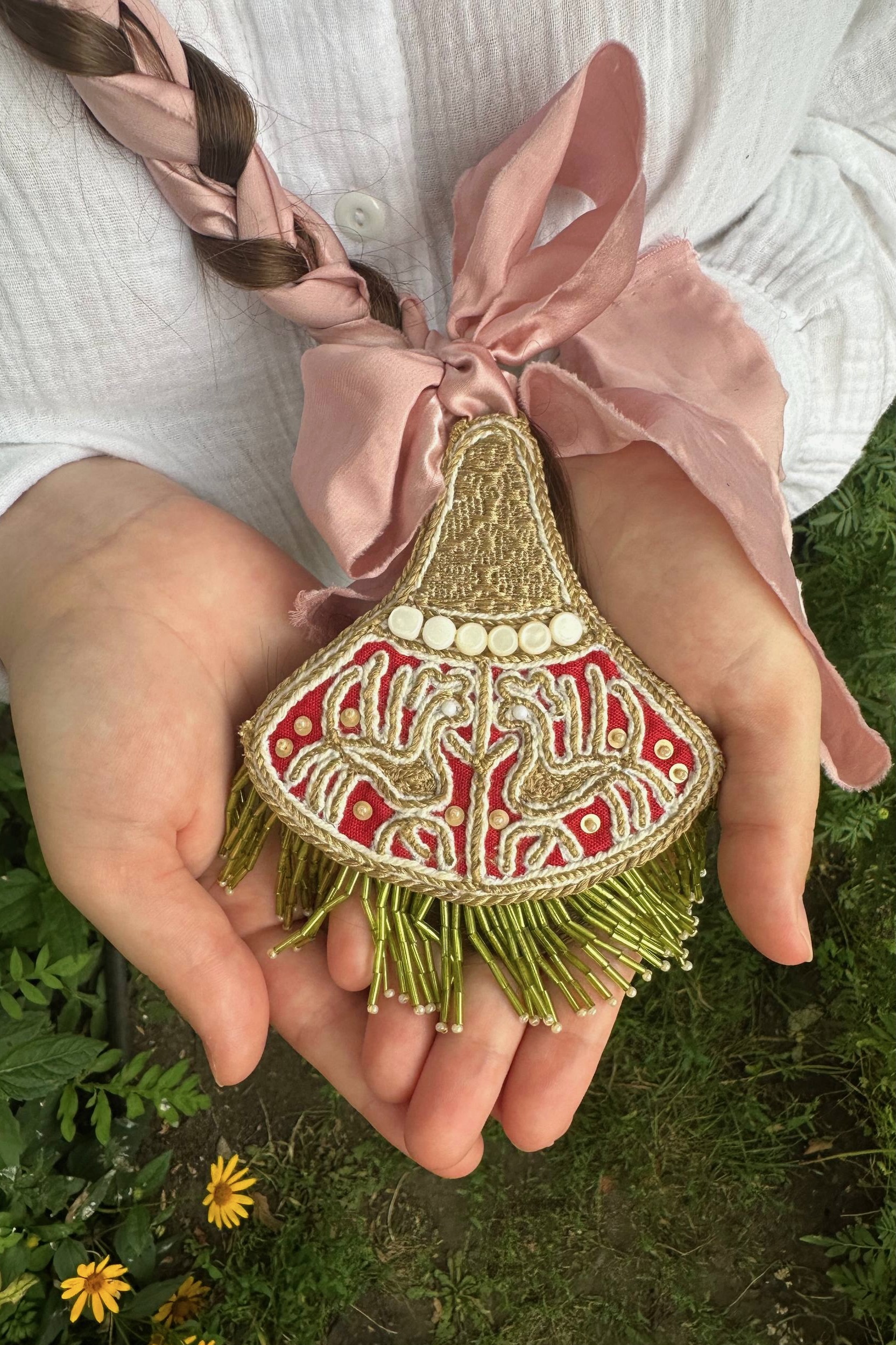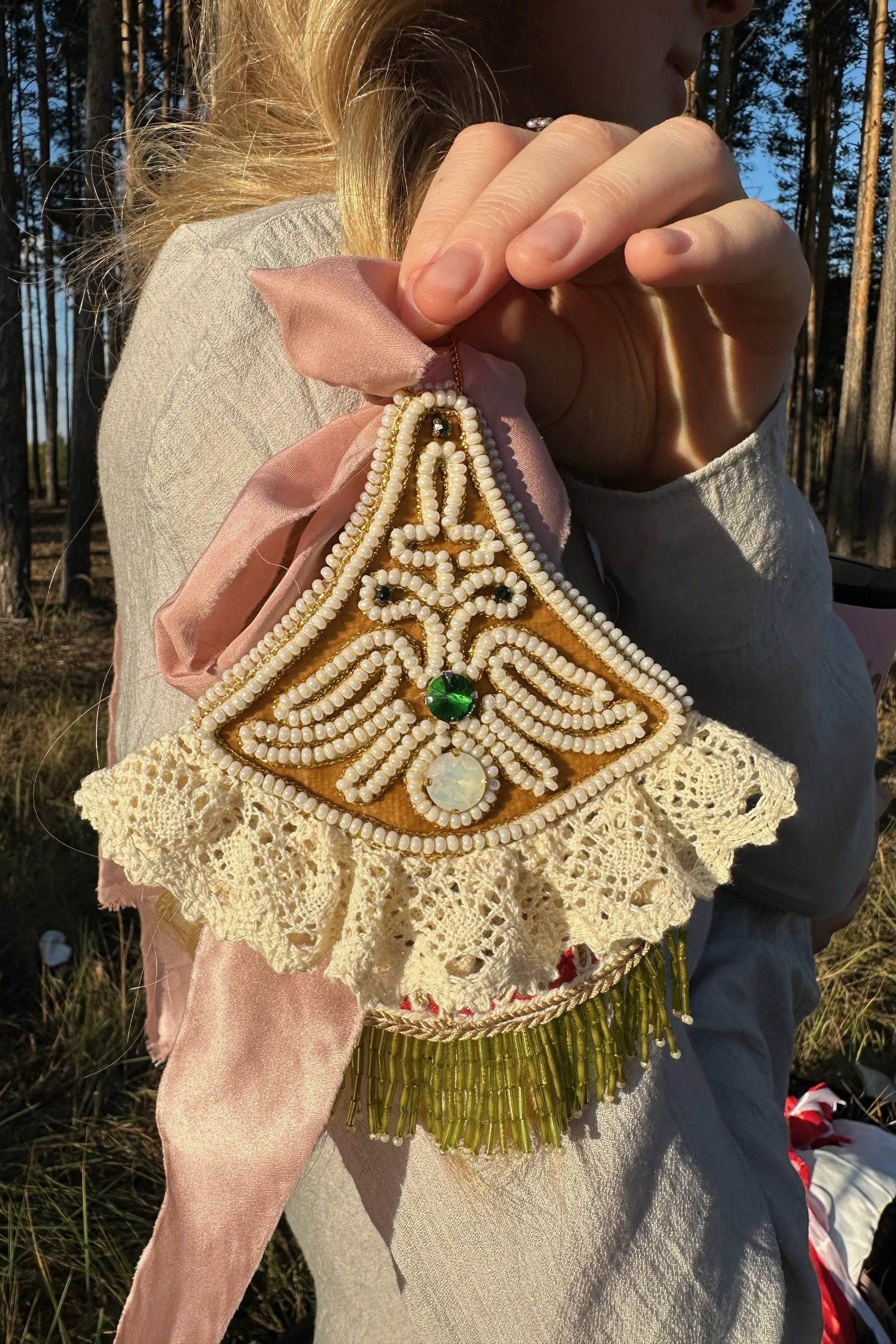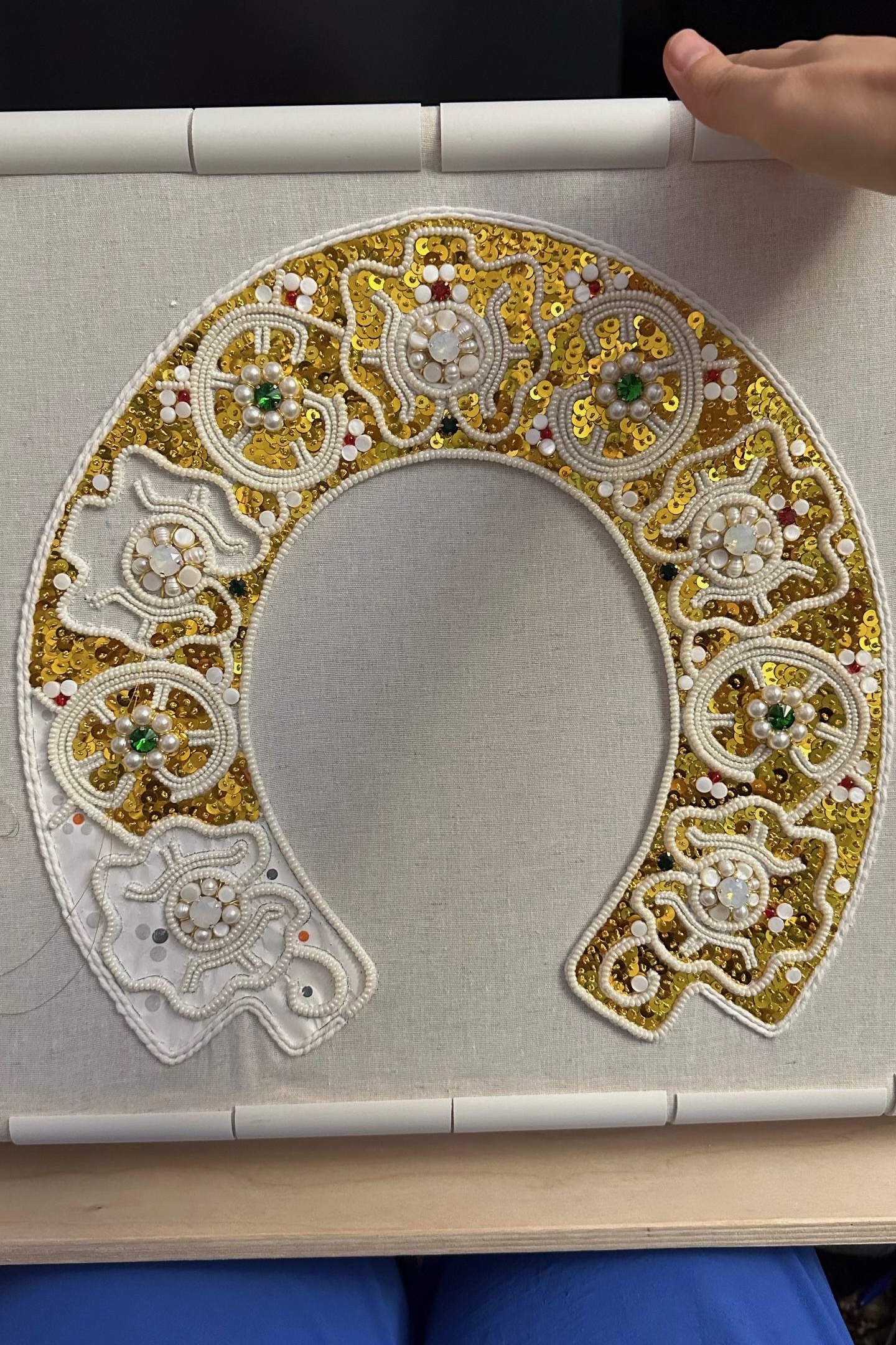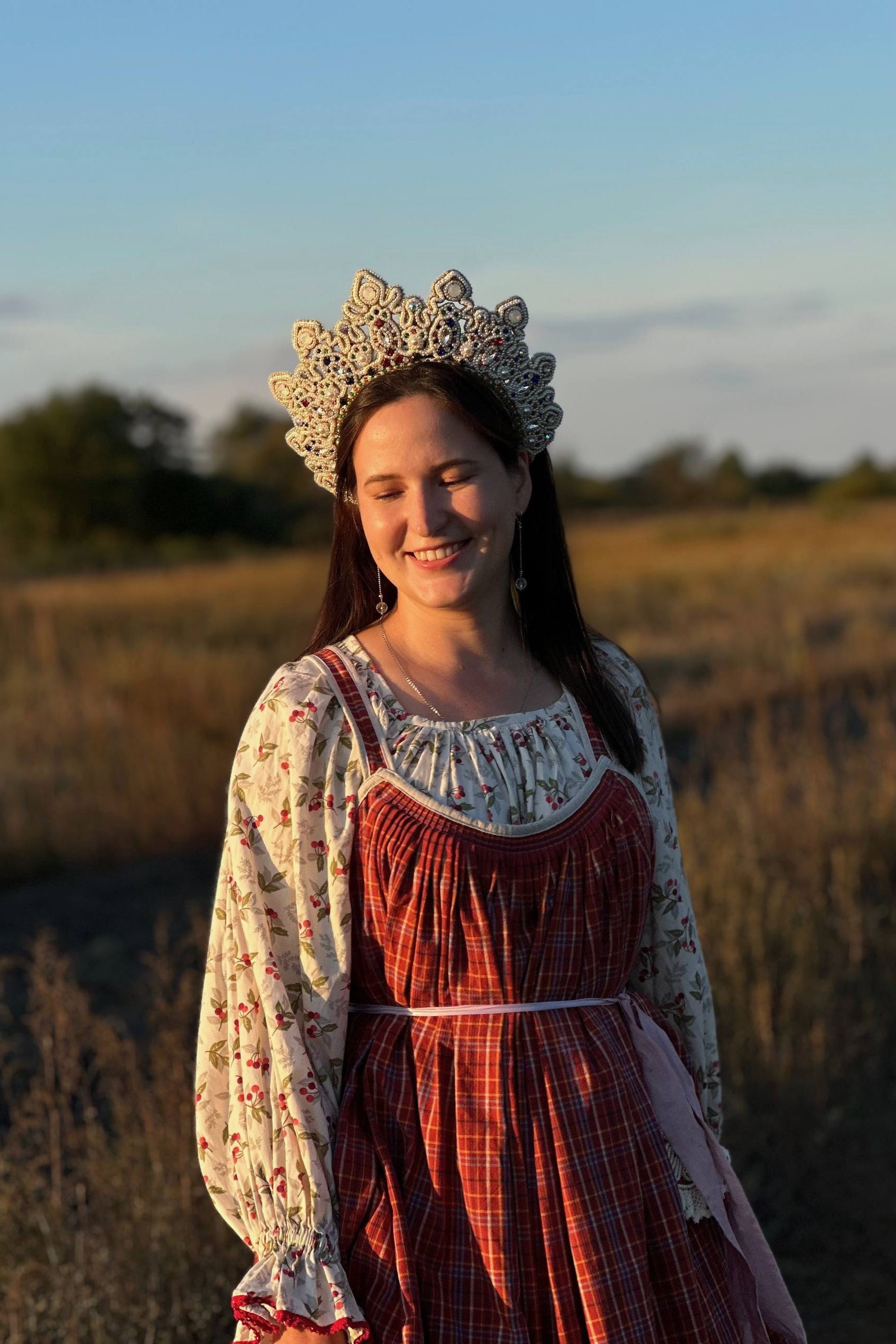 К этой технике меня привело увлечение индийской культурой, национальной одеждой, украшениями Индии. Рассматривая их, я подумала, что надо бы узнать, какие у нас были украшения и головные уборы. Погуглила и нашла кокошники и венцы в технике сажения. Было очень интересно, хотелось научиться делать такое своими руками. Я прошла несколько курсов и теперь могу создавать в технике сажения по бели венцы, косники и ожерелки. Загадывать на будущее не хочу, но есть желание и дальше развиваться, а также делать изделия на заказ.