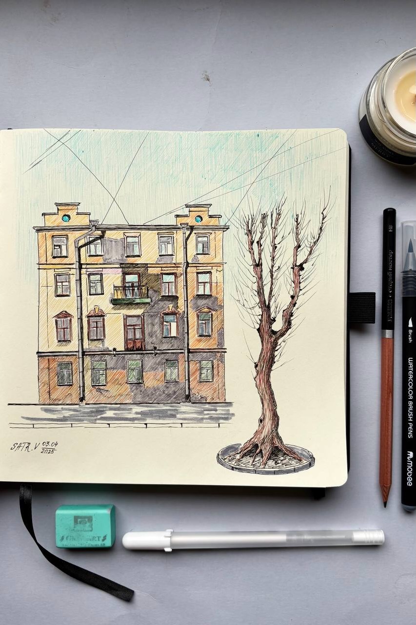 Я рисую уже несколько лет, очень нравится процесс! Мечтаю выйти на более профессиональный уровень. В основном обращаюсь к сюжетам города, иногда занимаюсь ботанической живописью. Как правило, это акварель, цветные карандаши и ручки, из живописи предпочитаю темперу.