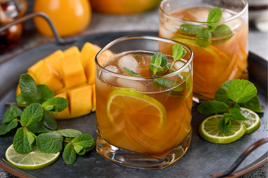Добавить сок манго. Разлить по стаканам со льдом. Украсить холодный чай веточками мяты и ломтиками лайма.