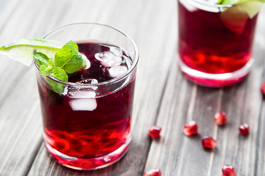 Добавить гранатовый сок и мёд, разлить по стаканам. Всыпать лёд. Украсить зёрнами граната, ломтиками лайма и мятой.