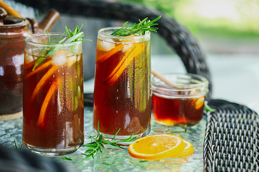 В айс ти добавить мёд и выжатый из апельсина сок. Разлить по стаканам и всыпать лёд. Украсить оставшимся розмарином.