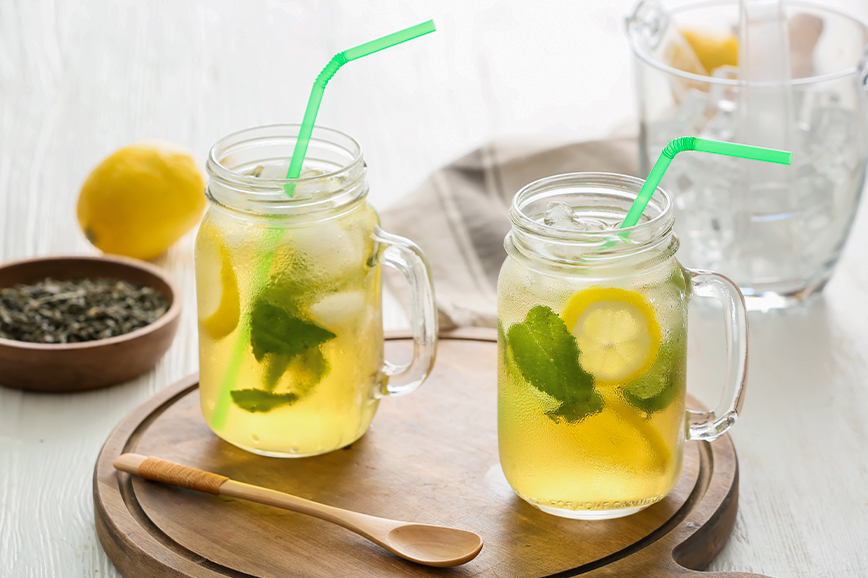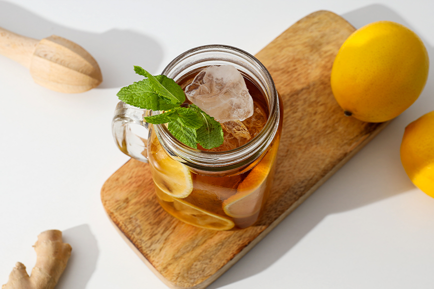 Напиток с тропическими нотками. Лайм и мята добавляют освежающей яркости, превращая холодный чай в летний коктейль без капли алкоголя.