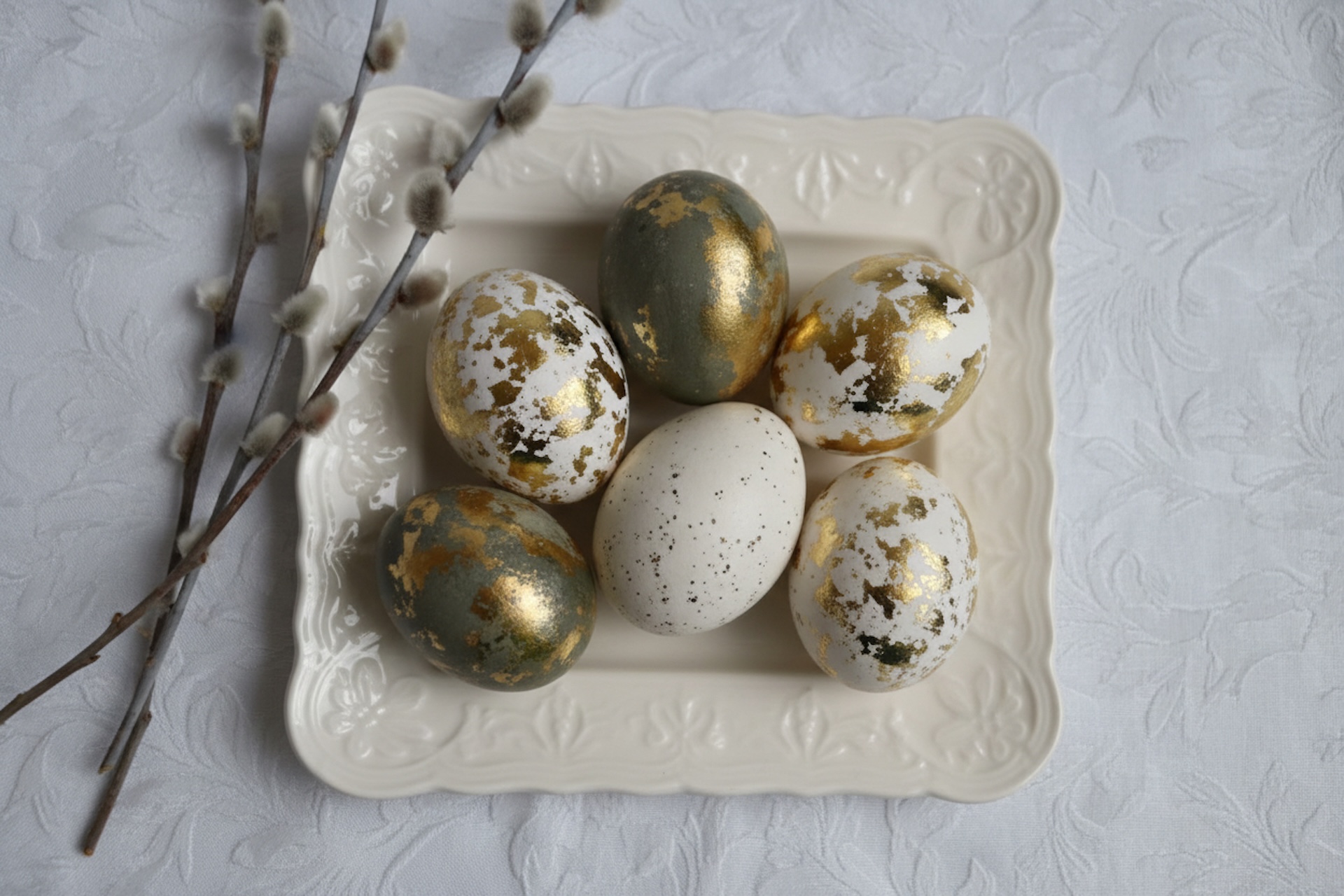 Для этого способа понадобится тонкая металлическая фольга — поталь. Ей покрывают сваренные вкрутую яйца для создания золотых или серебристых элементов.