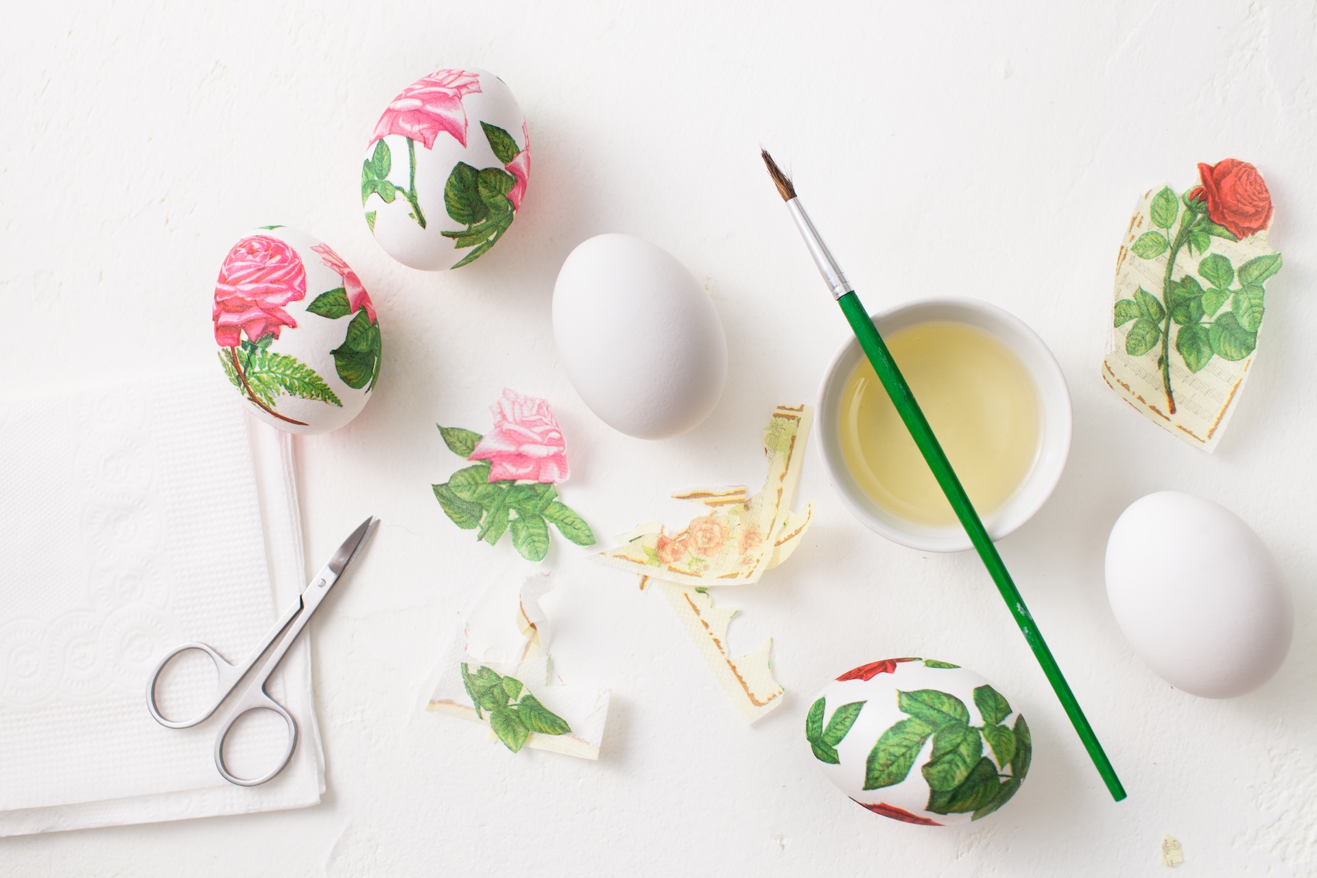 С многослойной салфетки аккуратно снимите верхний слой с рисунком, а затем приклейте его на яйцо с помощью сырого яичного белка. Для этого скорлупу обмажьте белком с помощью кисточки, затем приложите картинку и сверху ещё раз покройте всё белком. Получается яркий, детализированный узор, напоминающий ручную роспись.