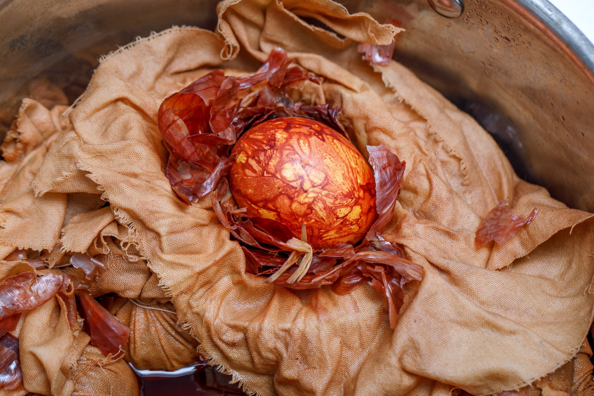 Чтобы этого добиться, нужно измельчить луковую шелуху, например нарезать ножницами. В получившейся массе обваляйте влажное сырое яйцо, чтобы шелуха прилипла к скорлупе. Затем плотно заверните всё в марлю или капрон, погрузите в холодную воду с небольшим количеством соли, доведите до кипения и варите около 10 минут. Выключите огонь и оставьте яйца остывать в отваре.