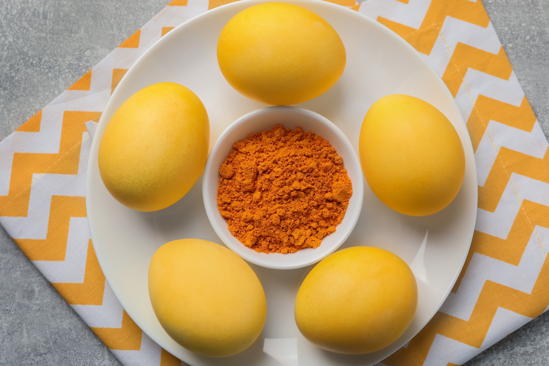 В воде с куркумой можно замочить уже готовые яйца на 2–4 часа. Либо можно сварить их в растворе. Второй вариант предпочтительнее, поскольку даёт более яркий и насыщенный цвет.