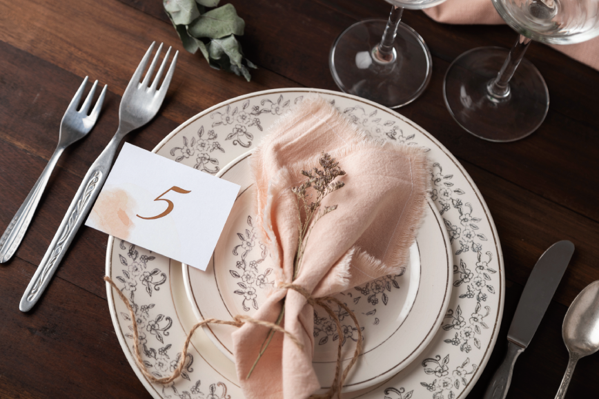 - Салфетки. Подойдут как текстильные, так и бумажные. Тканевые салфетки должны быть большого размера, чтобы прикрывали колени. Их можно разместить на тарелке или рядом с приборами. Бумажные подкладывают под край подстановочной тарелки или расставляют в специальных салфетницах.