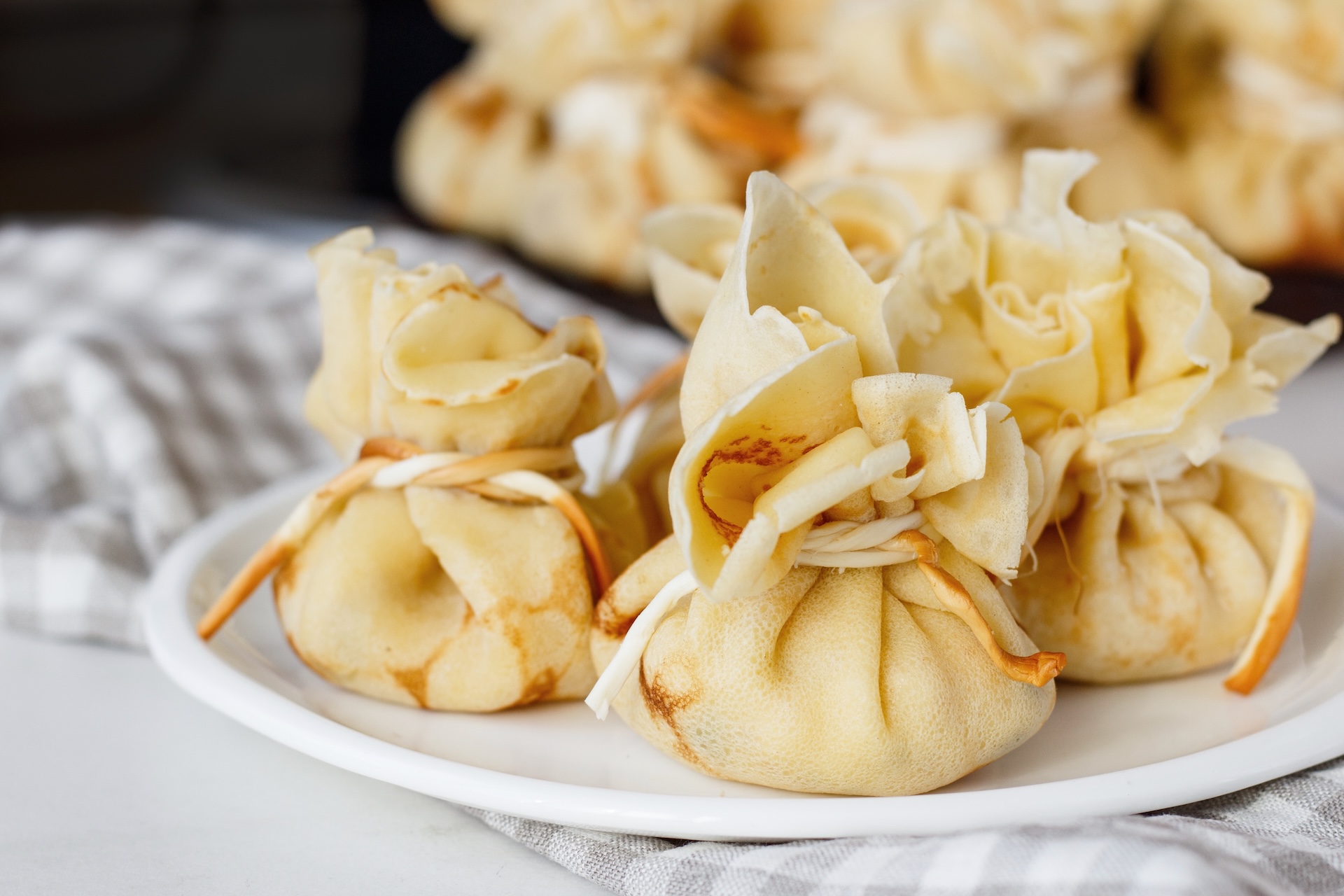 Этот способ заворачивания блинов подходит в первую очередь для несладких начинок, потому что в качестве верёвочки обычно используют перо зелёного лука или ломтик сыра-косички.