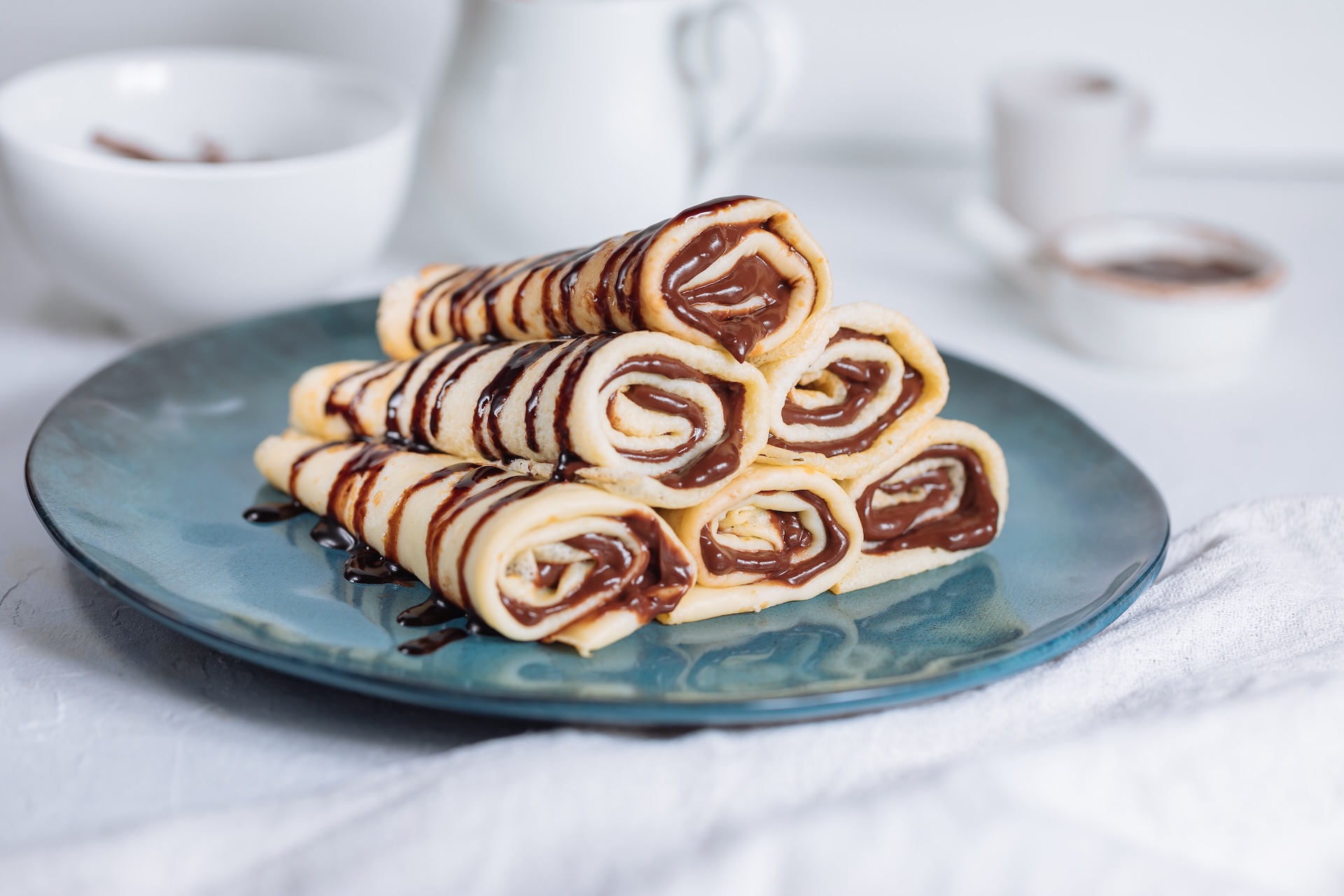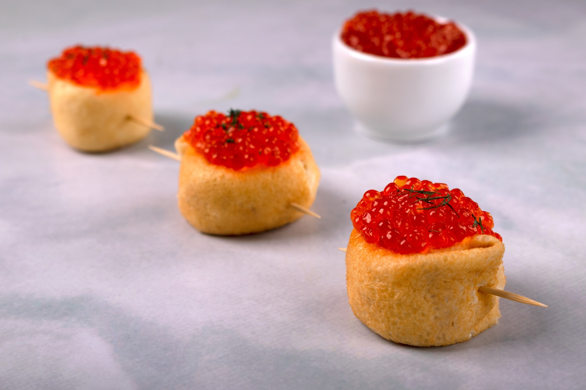 С такой подачей придётся повозиться. Зато этот способ сворачивания идеально подходит для праздничного стола. В качестве начинки лучше всего работают густые намазки и паштеты. Сверху можно дополнить улитки топингом. Например, использовать сочетание творожного сыра и икры или шоколадной пасты и свежих фруктов.