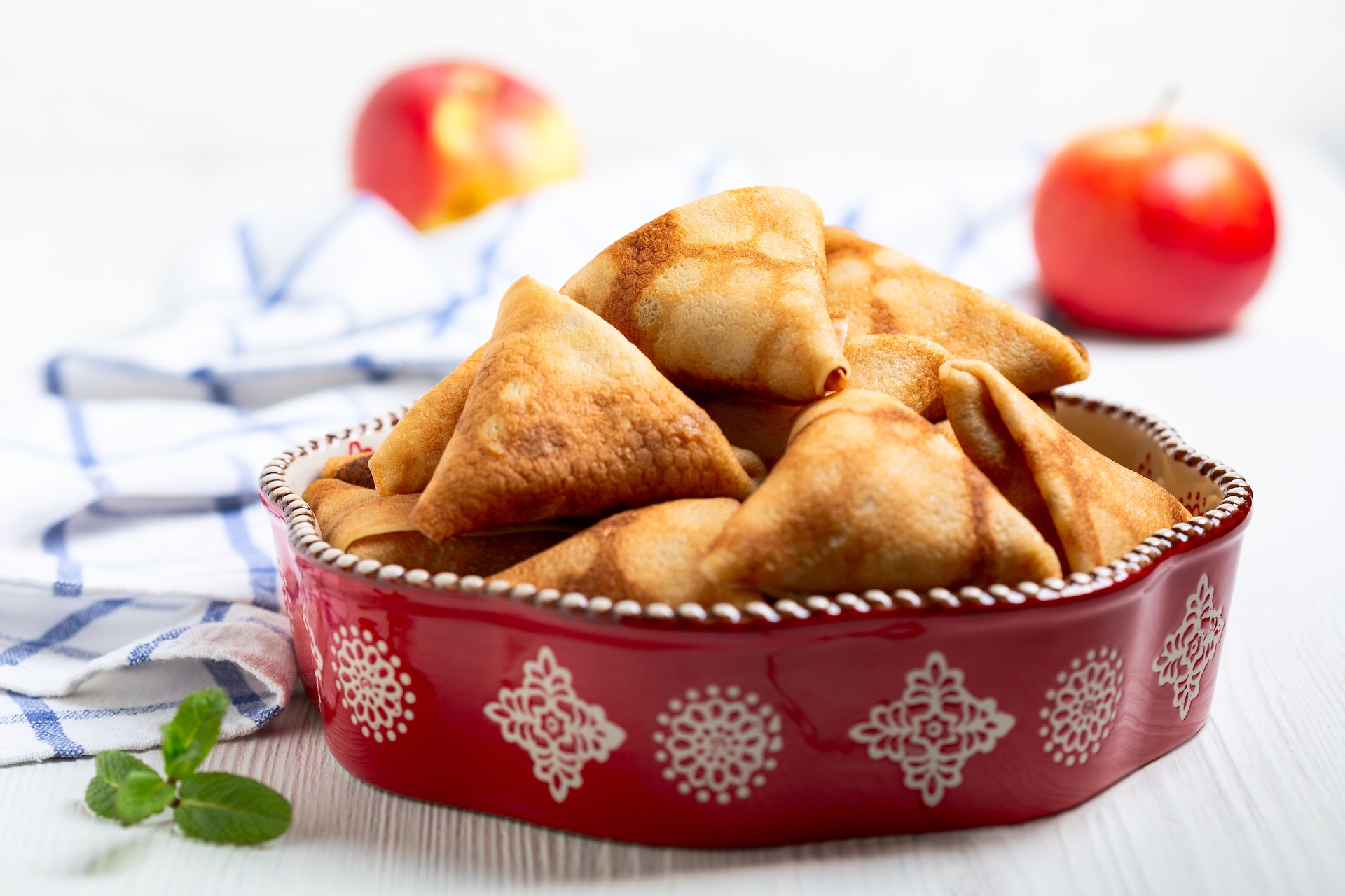 Свёрнутые треугольником блинчики делаются просто, выглядят эффектно и удобны во время еды, потому что начинка не выпадает.