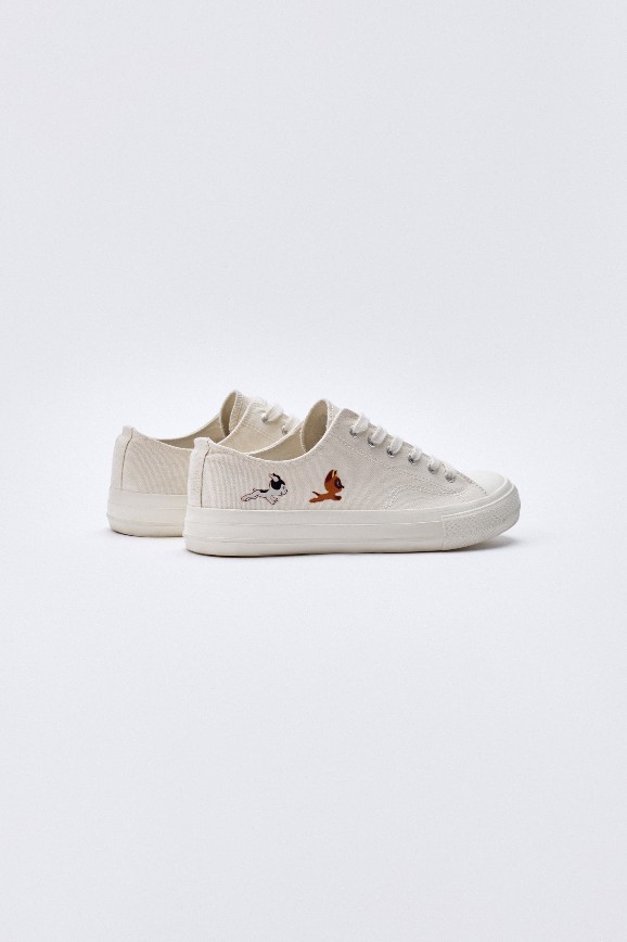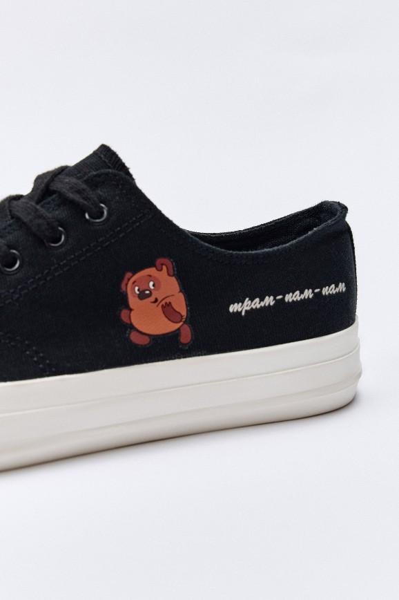 Всего в линейке две версии. Одна молочного цвета, украшенная героями мультфильма про котёнка Гава. Другая — чёрная с персонажами из «Винни-Пуха». Кеды не выглядят как детская обувь, наоборот, это пример классной стилизации. Они аккуратно смотрятся на ноге из-за минималистичного дизайна: светлая подошва, однотонный цвет, шнурки в том же оттенке. Принт вписан органично, как маленький акцентный штрих. Он не перетягивает внимание, но, когда замечаешь, как котёнок Гав убегает от щенка Шарика, уже трудно отвести взгляд.