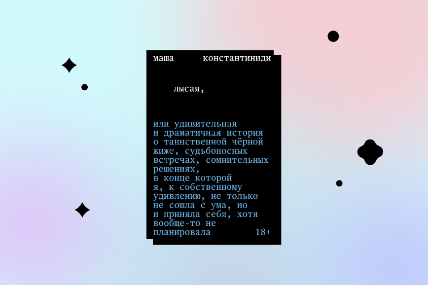 «Лысая, или Удивительная и драматичная история о таинственной чёрной жиже, судьбоносных встречах, сомнительных решениях, в конце которой я, к собственному удивлению, не только не сошла с ума, но и приняла себя, хотя вообще-то не планировала»