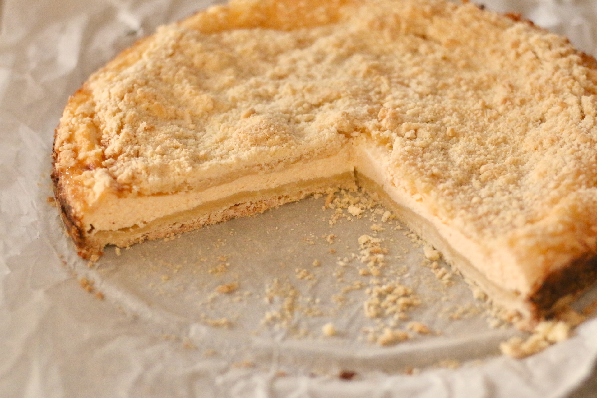 Королевская ватрушка выглядит как пирог с секретом. Сверху — рыхлая и сладкая песочная крошка, а внутри — мягкая творожная начинка. На вкус получается что-то среднее между чизкейком и сырником. Начинка нежная, кремовая, с лёгкой кислинкой.