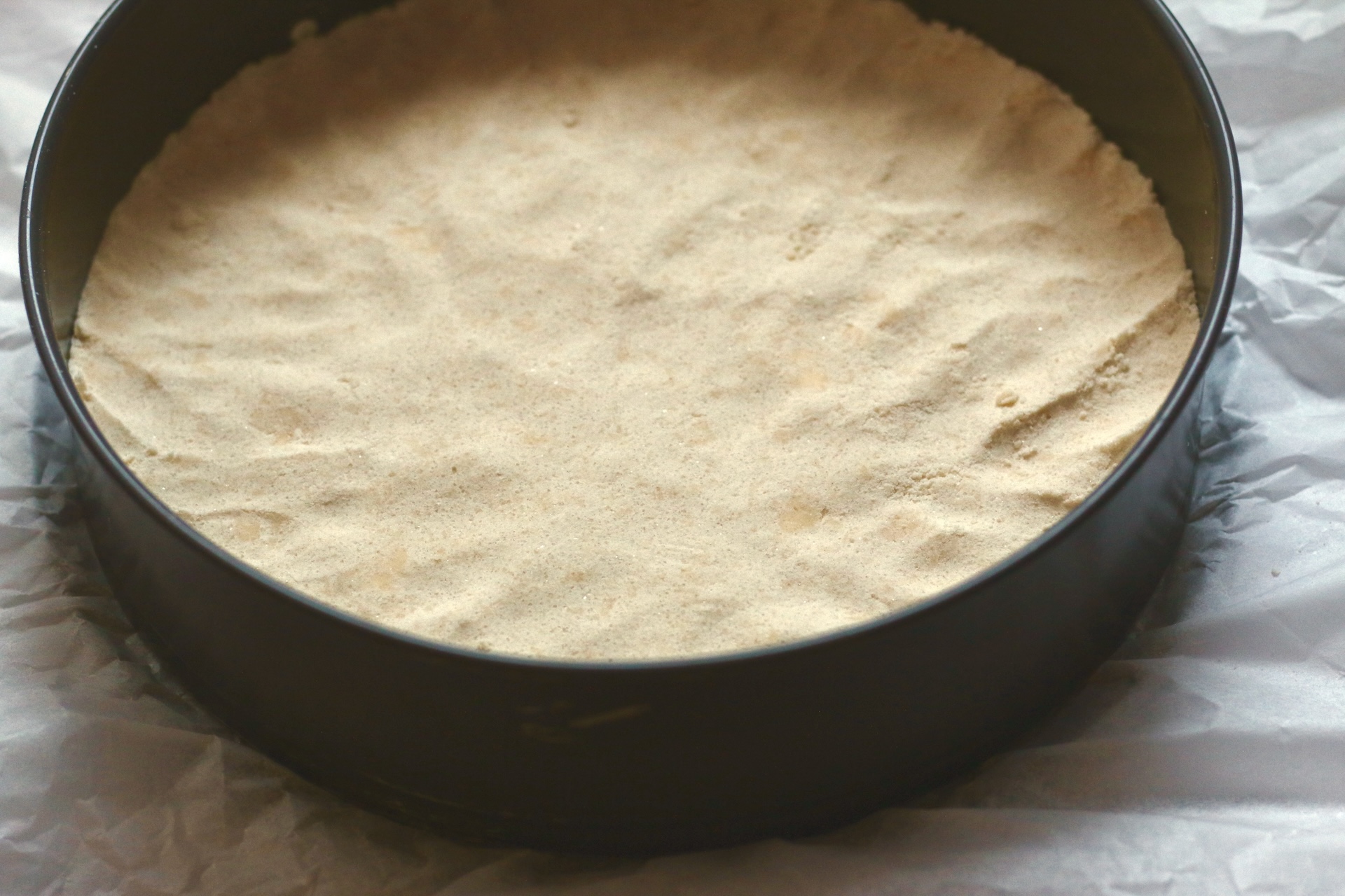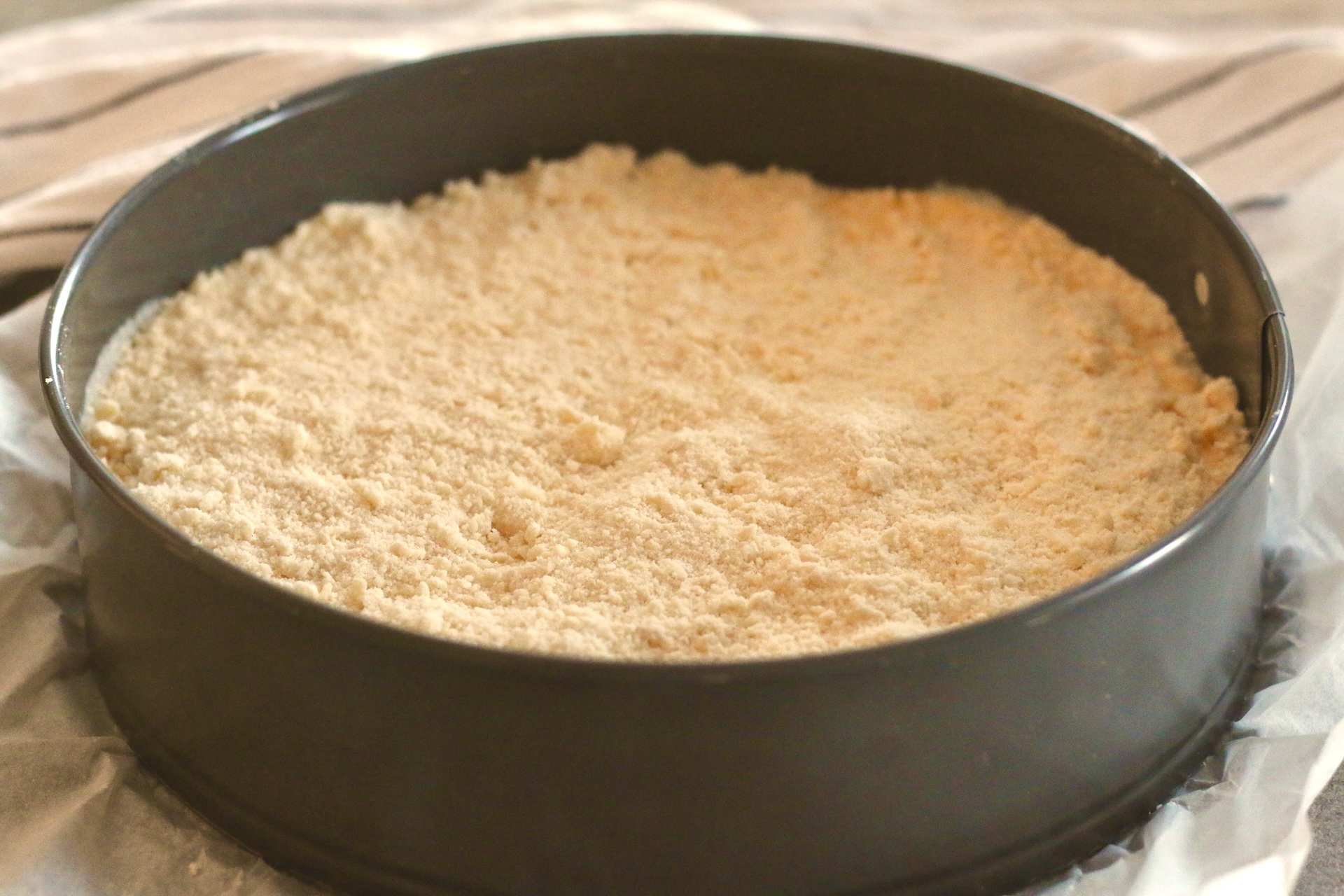 5. Половину получившейся крошки выложите в застеленную пекарской бумагой форму и утрамбуйте.