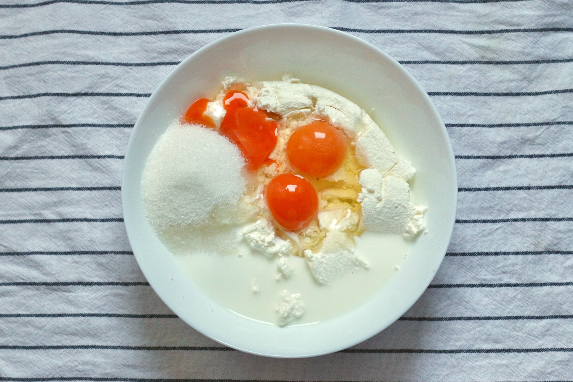 6. Приготовьте начинку. Для этого соедините творог, яйца, обычный и ванильный сахар и молоко.