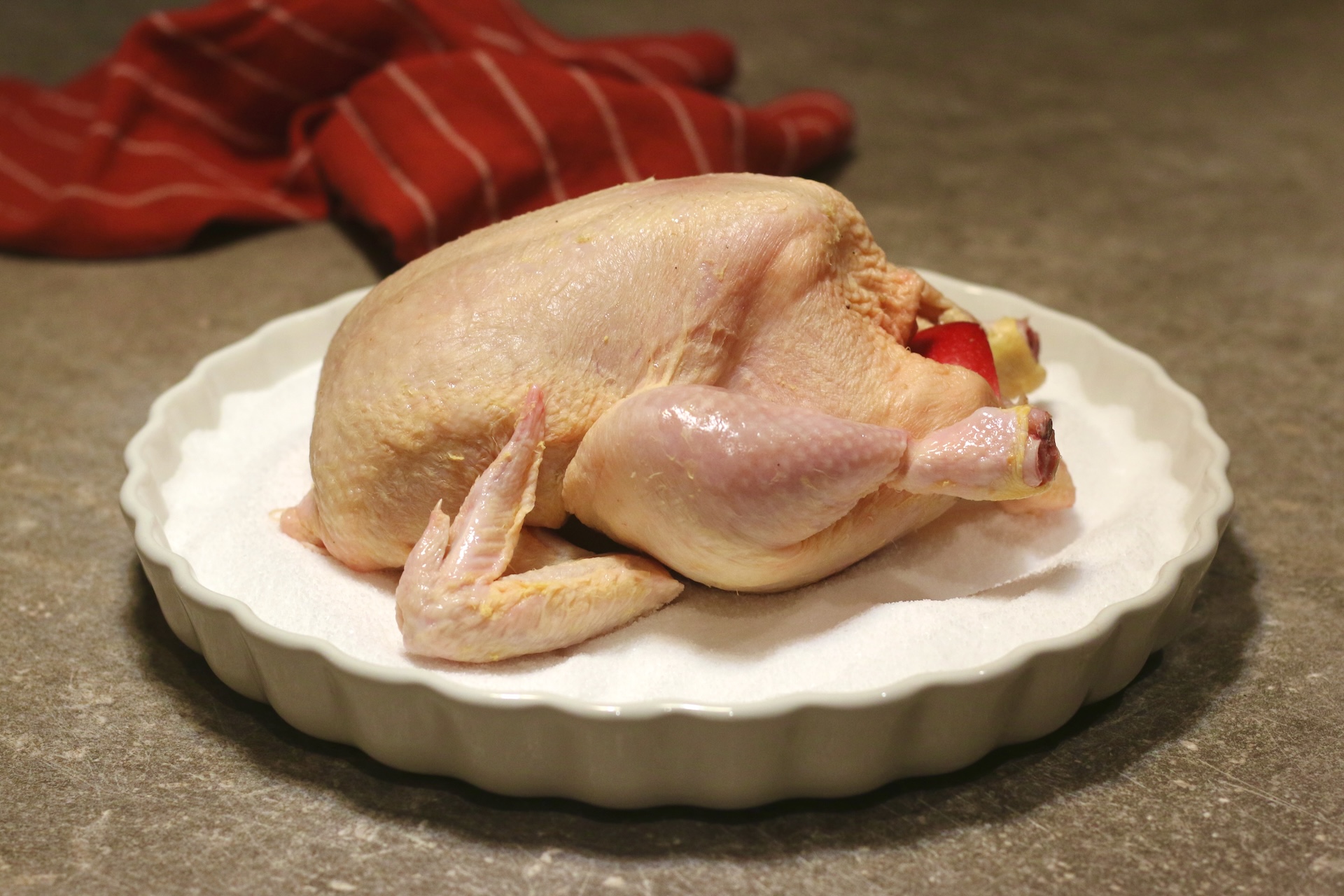 7. Уложите на подушку из соли курицу грудкой вверх.