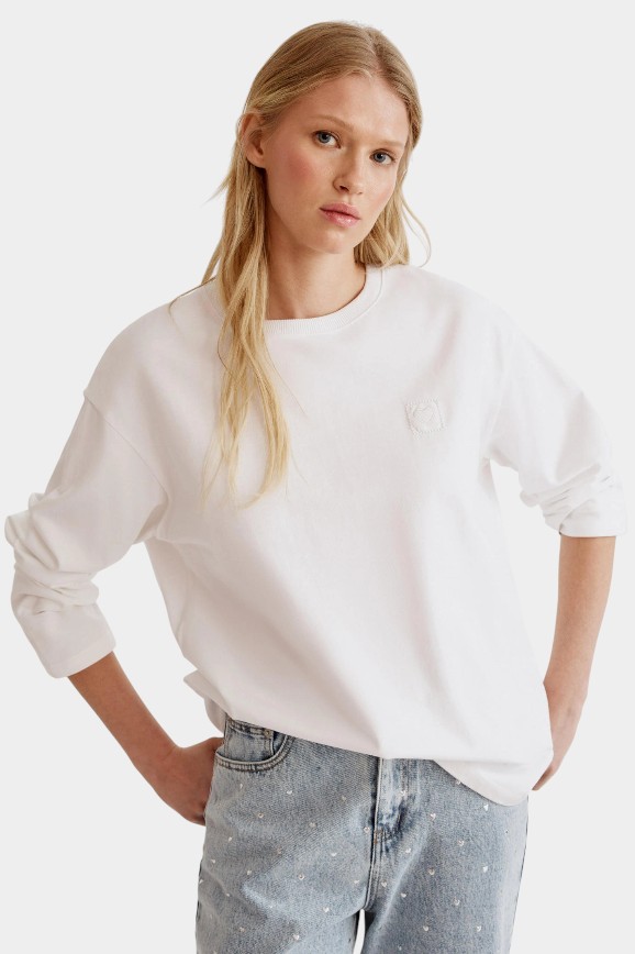 Базовая вещь, сделанная из стопроцентного хлопка. В линейке идёт несколько спокойных цветов: белый, бежевый и розовый. Лонгслив свободно сидит по фигуре и создаёт ощущение лёгкой небрежности, будто вы накинули его перед самым выходом. В сочетании с простыми джинсами и собранными в небрежный хвост волосами он создаёт тот самый эффект «я потратила на сборы не больше пяти минут».