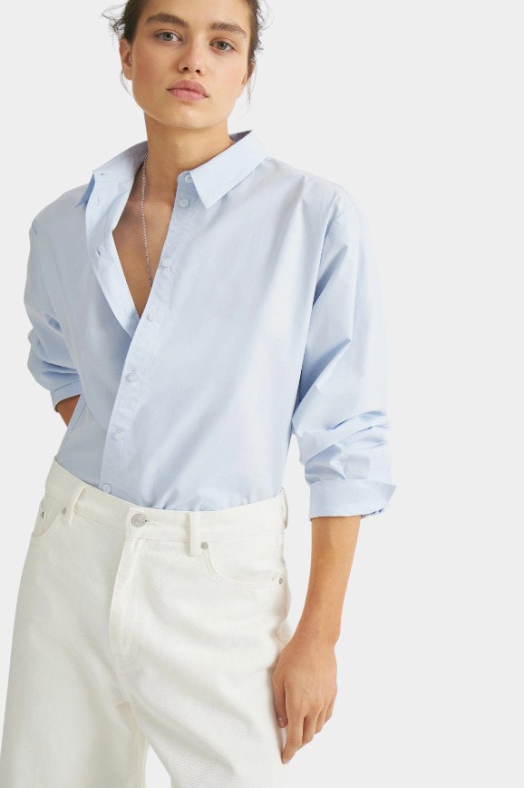 Ещё один способ добавить образу небрежности. Как и полагается вещам в стиле ленивого шика, рубашка сделана из качественной натуральной ткани — хлопка. Цвет универсальный — светло-голубой. Её можно носить навыпуск, заправленной или расстёгнутой поверх топа. Важно, что в ленивом шике рубашка не выглядит офисной, она — часть повседневного расслабленного гардероба.