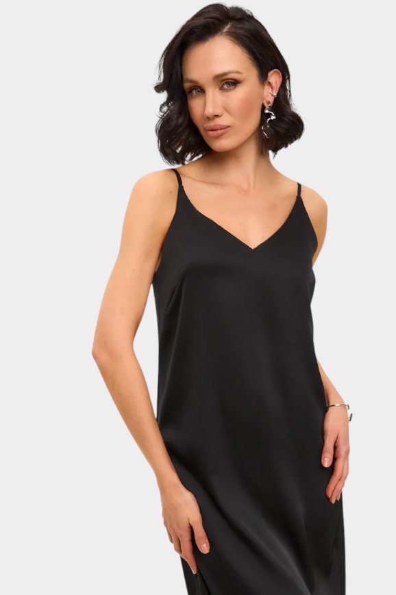 Оно ненавязчиво подчёркивает фигуру. Главное выбирать простой фасон и нейтральный оттенок. Тут на выбор чёрный, коричневый, серый. Платье-комбинация легко адаптируется под сезон с помощью свитера или жакета и подходит для женщин, которые никуда не спешат, потому что ассоциируется с ранним утренним солнцем и медленным началом дня.