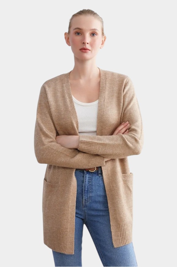 Тоже один из тех предметов гардероба, который делает образ расслабленным. И лучше выбирать модель без пуговиц, чтобы его можно было, словно наспех, легко накинуть поверх платья, майки или рубашки. Эта модель как раз такая. Бежевый цвет, свободный фасон — не слишком объёмный, но и не слишком обтягивающий. И мягкая приятная на ощупь ткань.