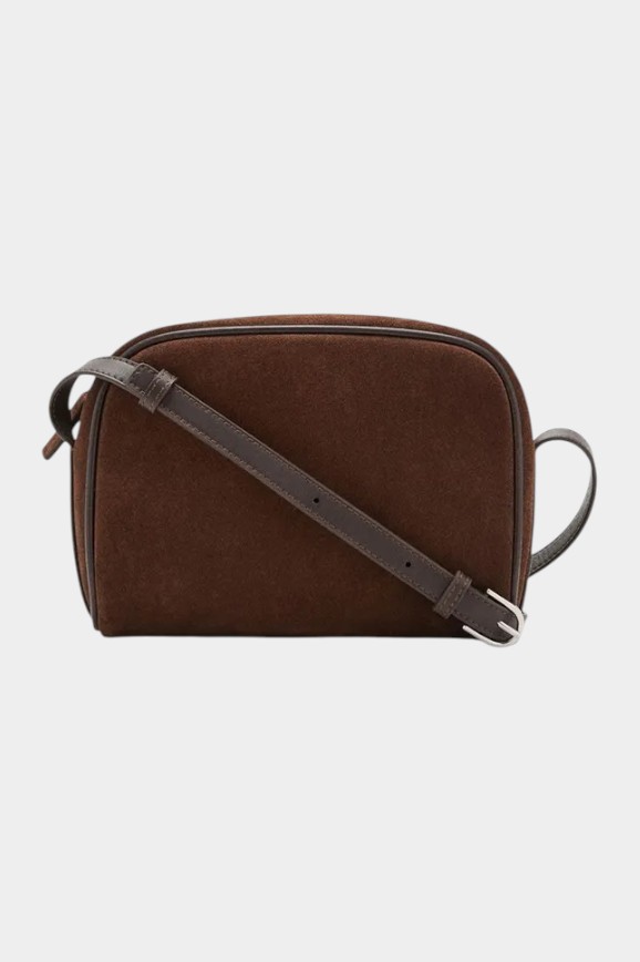 Сумка не должна перетягивать внимание на себя: базовая форма, нейтральный цвет и минимум деталей. Словно подходит ко всему гардеробу сразу. Эта модель из натуральной замши коричневого цвета с единственным карманов, в который поместиться всё самое необходимое: документы, банковская карта, мобильный телефон и ключи. Она на длинном ремешке, который можно отрегулировать.