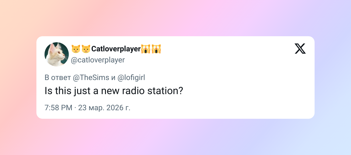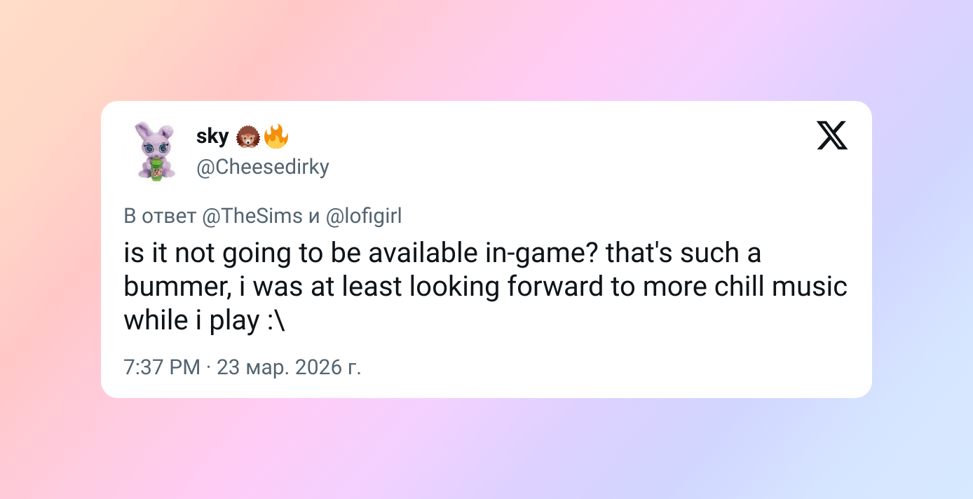 Вместо того чтобы порадовать фанатов игры контентом с девочкой и присущей ей атрибутикой, разработчики объявили о запуске плейлиста с музыкой из The Sims в стиле Lofi Girl. В описании говорится, что это «любимые классические треки из The Sims, ремикшированные в стиле лоу-фай», которые можно слушать во время игры или учёбы.