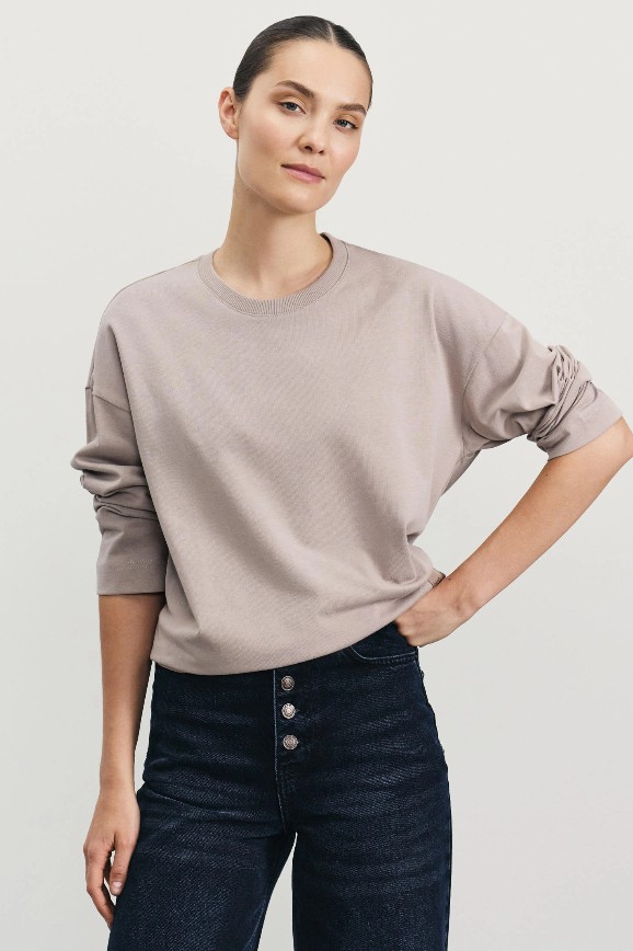 Качественный лонгслив их стопроцентного хлопка в цвете тауп (так называют благородный оттенок на грани серого и коричневого). Он идеально вписывается в базовый гардероб. Вещь выглядит дорого, но благодаря свободному крою ощущается как любимая пижамка, которая нежно обнимает плечи.