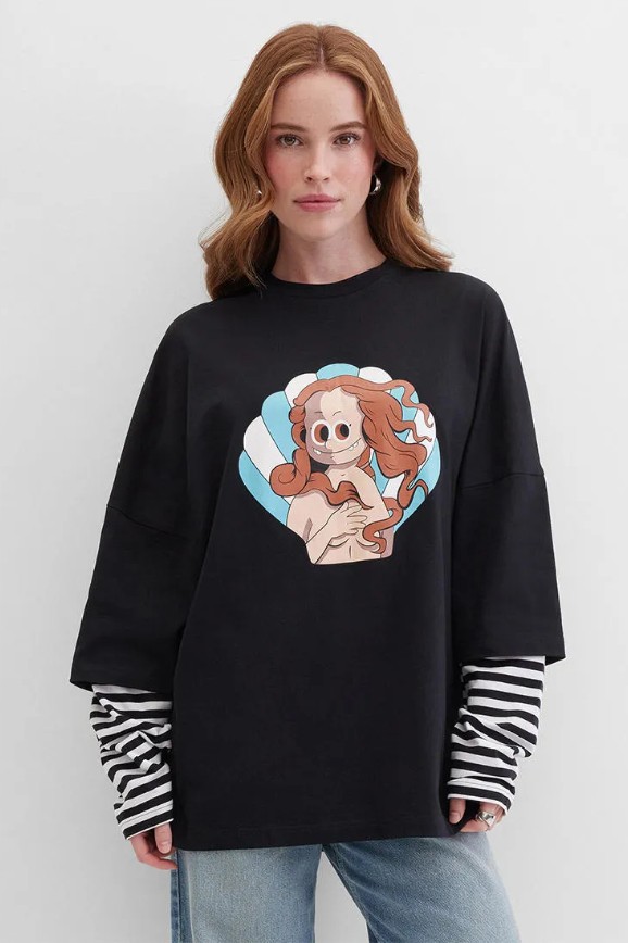 От этого лонгслива веет духом свободы. Он имитирует футболку, надетую поверх кофты. Ещё и с хулиганским принтом — Венера Боттичелли ещё никогда не была настолько игривой. Образ получается объёмным, дерзким, с ноткой протеста. Так и хочется дополнить его кедами Converse и наушниками, в которых поёт Аврил Лавин.