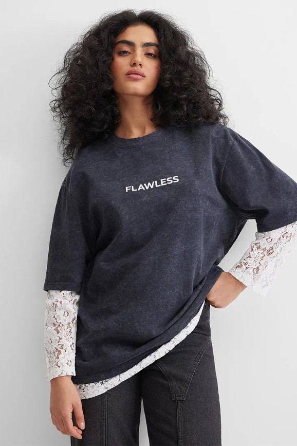 Когда ты и папина принцесса, и мамина бандитка. Лонгслив имитирует гранжевую футболку, надетую поверх нежной кружевной кофточки. У изделия трендовый оверсайз-крой, который позволяет чувствовать себя легко и свободно. Окружающие точно будут спрашивать, откуда лонг, а вы в ответ — загадочно улыбаться.
