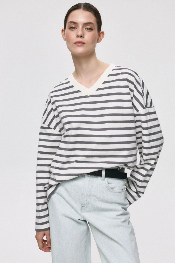 Этой осенью в моде полосатые лонгсливы. С одной стороны, от них веет французским шармом. С другой — ностальгией по девяностым. У этого варианта оверсайз-крой, треугольный вырез и небольшие разрезы по бокам. Можно дополнить его красной помадой, представляя себя прогуливающейся по улочкам Парижа. А можно — широкими джинсами и сумкой с обвесом: получится образ в стиле одной из лучших модных эпох.