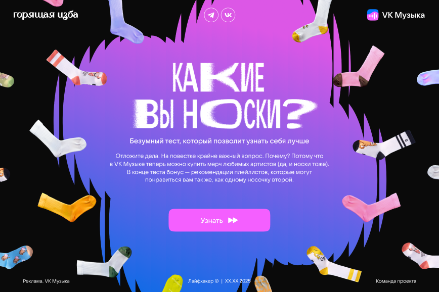 Делать тест про носки было одно удовольствие — не часто в работу приходит такой по-хорошему сумасшедший проект. При этом были и вызовы: нужно было выдержать золотую середины, чтобы не уйти в откровенный треш и не сделать что-то стыдное и неловкое. Кажется, у нас получилось. Отдельно хочется отметить работу с VK! У нас с коллегами создался тандем, где каждая сторона друг друга слышала и делилась мнением, что привело к прекрасному результату. Я, кстати, рэп-носок!
