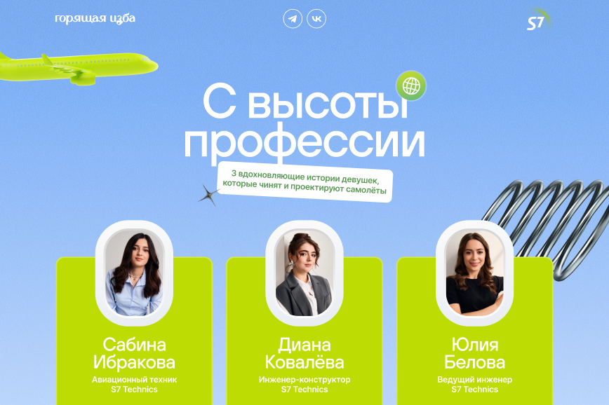 В проекте мы соединили айдентику S7 с визуальными приёмами на тему авиации и технологичности, добавили анимацию, чтобы усилить ощущение движения и «полёта». В итоге получился яркий и динамичный проект. Было интересно работать с реальными историями героинь — у каждой из них чувствуется искренняя вовлечённость в профессию и ответственность за своё дело.