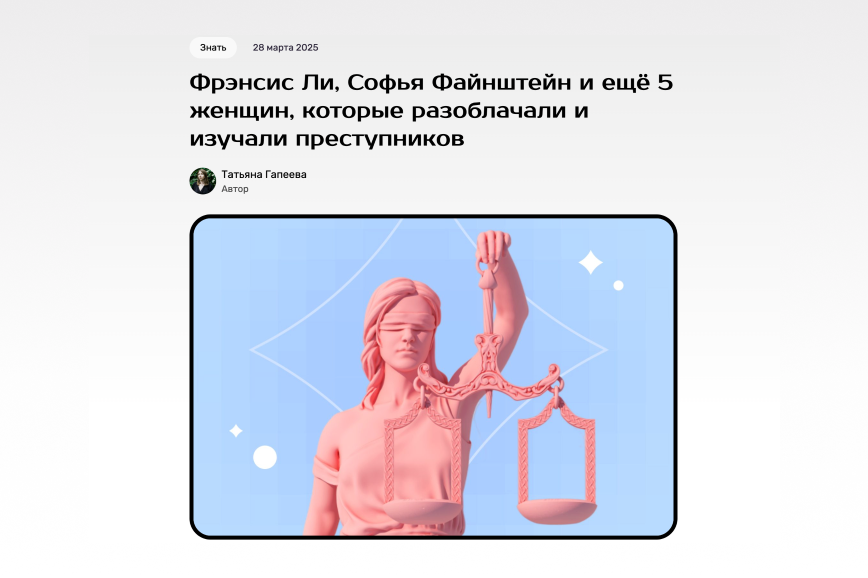 Тексты про женщин с интересной судьбой — это мы любим. Реальные истории про раскрытие преступлений — тоже. В статье для онлайн-кинотеатра PREMIER всё это сошлось. К премьере детективного сериала «Тайга» рассказали о жизни семи женщин, которые оставили след в мировой криминалистике. Например, Энн Бёрджесс помогла заложить основы профайлинга, а Софья Файнштейн сделала первый фоторобот в истории советского уголовного розыска. Текст прочитали более 10 тысяч человек.