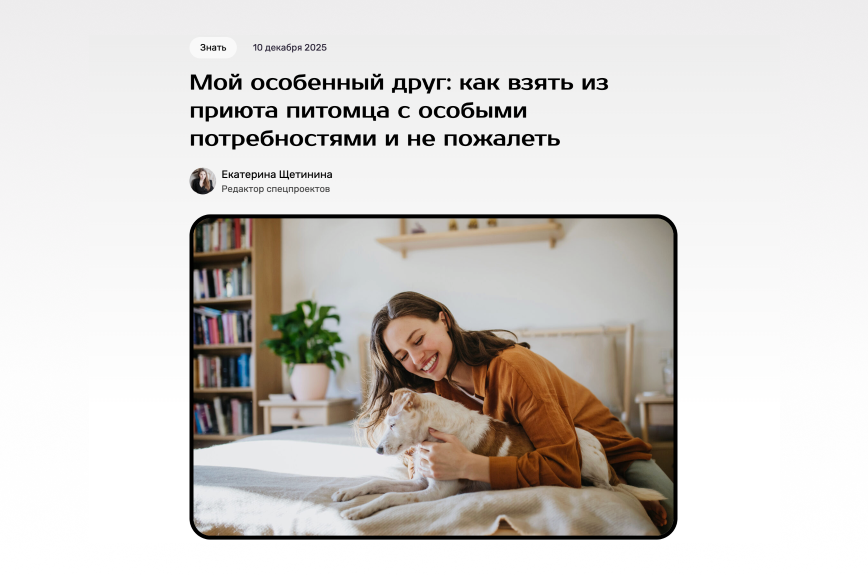 Это один из самых добрых и важных проектов, над которыми я работала в прошлом году. За каждой историей я увидела не просто «усыновили собаку» или «взяли кота», а большой путь — от адаптации до «это теперь наш член семьи». Работая над материалом, я пару раз всплакнула над каждой историей. Первый — когда слушала героев, второй — когда писала текст.