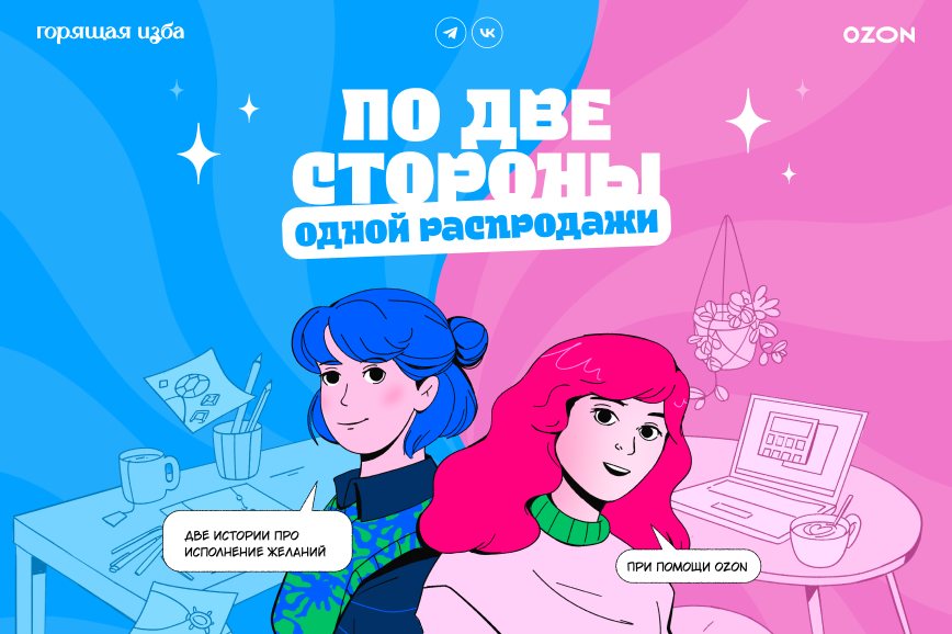 Декабрь — это «успеть до конца года», ощущение праздника и, конечно, распродажи. Скидки помогают проще исполнять мечты — свои и близких. Как раз об этом рассказывает комикс для Ozon. В нём сразу две главные героини: Аня из Екатеринбурга создаёт ювелирные украшения, Лена из Питера ищет новогодний подарок для подруги. Их истории переплетаются благодаря маркетплейсу — а общение в итоге выходит за рамки онлайна. Как так вышло — можно узнать, полистав комикс. Кстати, в нём не обошлось без наших любимых лягушек!