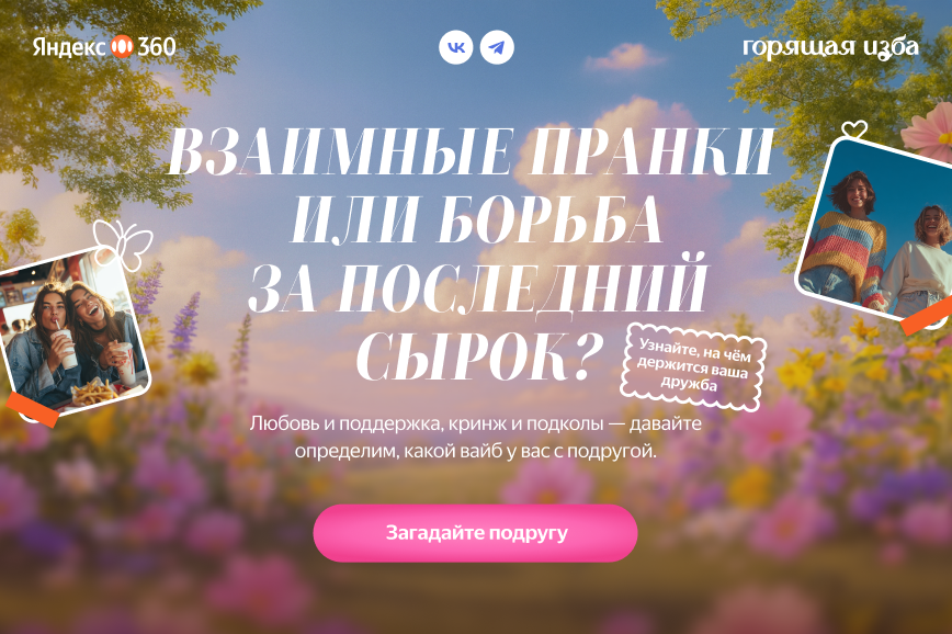 Одни подружки любят весь вечер уютно хихикать над реалити-шоу, другие — красиво сидеть в кафе. Привычки разные — и все они классные! Вместе с Яндекс 360 мы сделали забавный тест, который показывает, что является связующим элементом именно вашей дружбы. В конце вместе с результатом давали забавную картинку с лягушками — такую срочно хочется показать своей лучшей подруге.