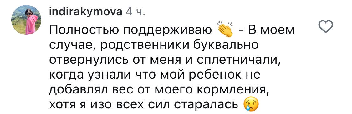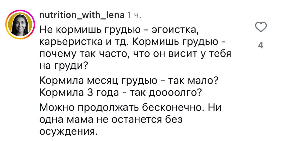 «Я всё время искала проблему в себе. Мол, у всех же получается, почему у тебя нет? Нанимала специалистов, тратила уйму денег, читала литературу, советовалась с другими мамами. В общем, делала всё, чтобы игнорировать особенности своего пути. <…> Мне было стыдно отказаться от ГВ. Я боялась, что это навредит моей дочери. Боялась потерять с ней эмоциональную связь. Короче, жила страхами и ожиданиями, в основном чужими. <…> Моя мама с самого начала говорила мне: „Если сложно тебе и ребёнку не корми“. Но я её не слушала. А ещё самое главное я не слушала себя и не относилась с уважением к собственному пути и его особенностям. <…> В итоге оказалось, что у дочери диагноз был не временный, не выдуманный. Настоящий. Мы живём с ним до сих пор. И те четыре-пять месяцев я вредила своим молоком. Да, звучит так себе, но это мой опыт».