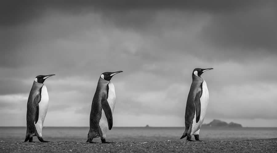 Ещё один снимок от Джулс Олдройд. На фоне тёмного атлантического неба она запечатлела трёх королевских пингвинов, выстроившихся на линии горизонта.