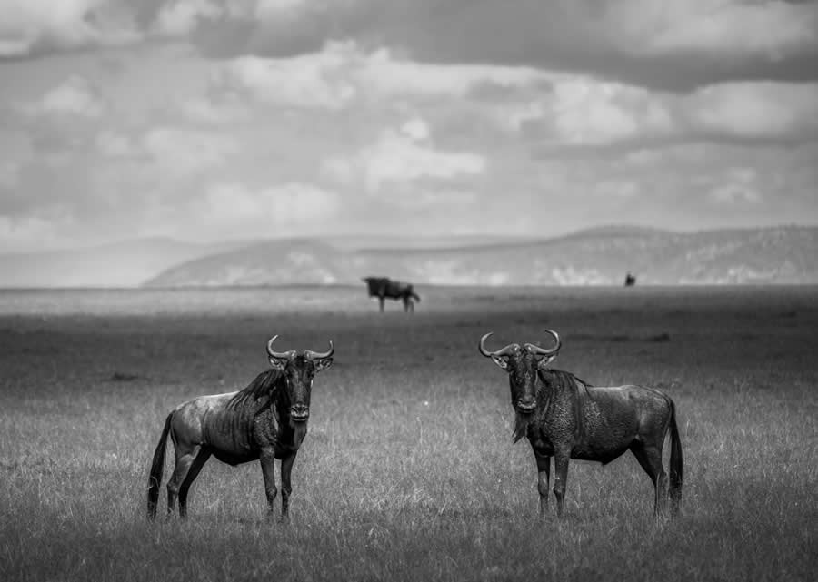 Зеня Леппер из США запечатлела двух самцов гну, на мгновение прервавших свой поединок из-за её появления. Вдали виднеется ещё один самец — он терпеливо ждёт момента, чтобы бросить вызов ослабевшему сопернику.