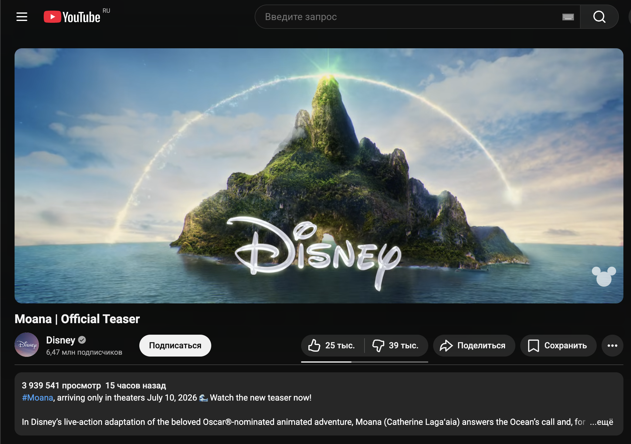 Disney презентовала первый тизер ремейка «Моаны» с живыми актёрами, но в сети приняли его неоднозначно. При 25 тысячах лайков ролик набрал 39 тысяч дизлайков. Пользователи сети сочли этот ремейк бессмысленным и созданным ради извлечения прибыли.