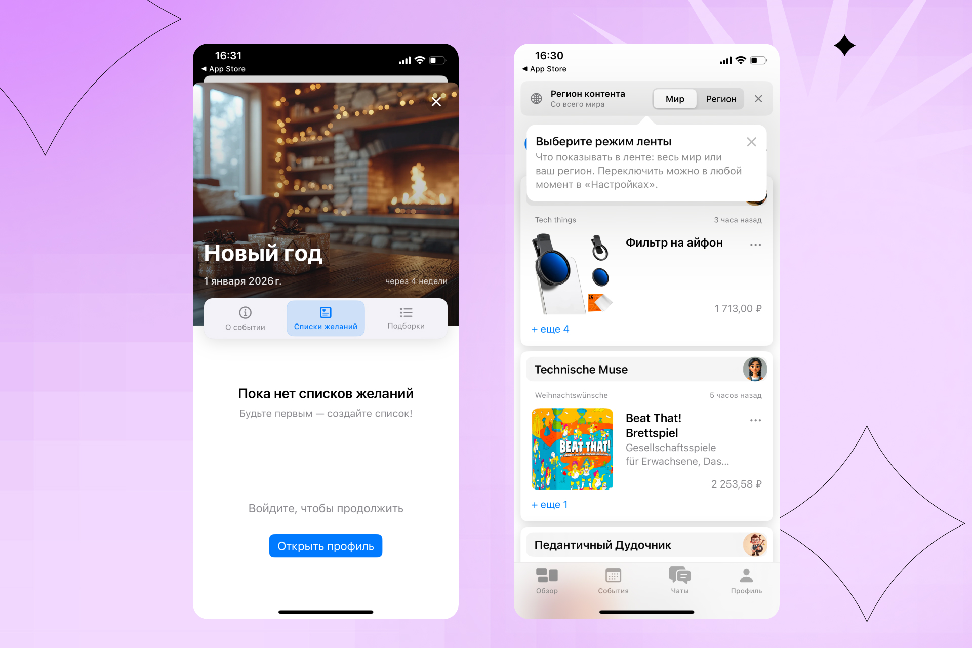 Кроме списков, приложение помогает организовывать события — дни рождения, свадьбы, встречи, корпоративы. В одном пространстве можно собрать участников, обмениваться комментариями, вести общий фотоальбом и распределять подарки.