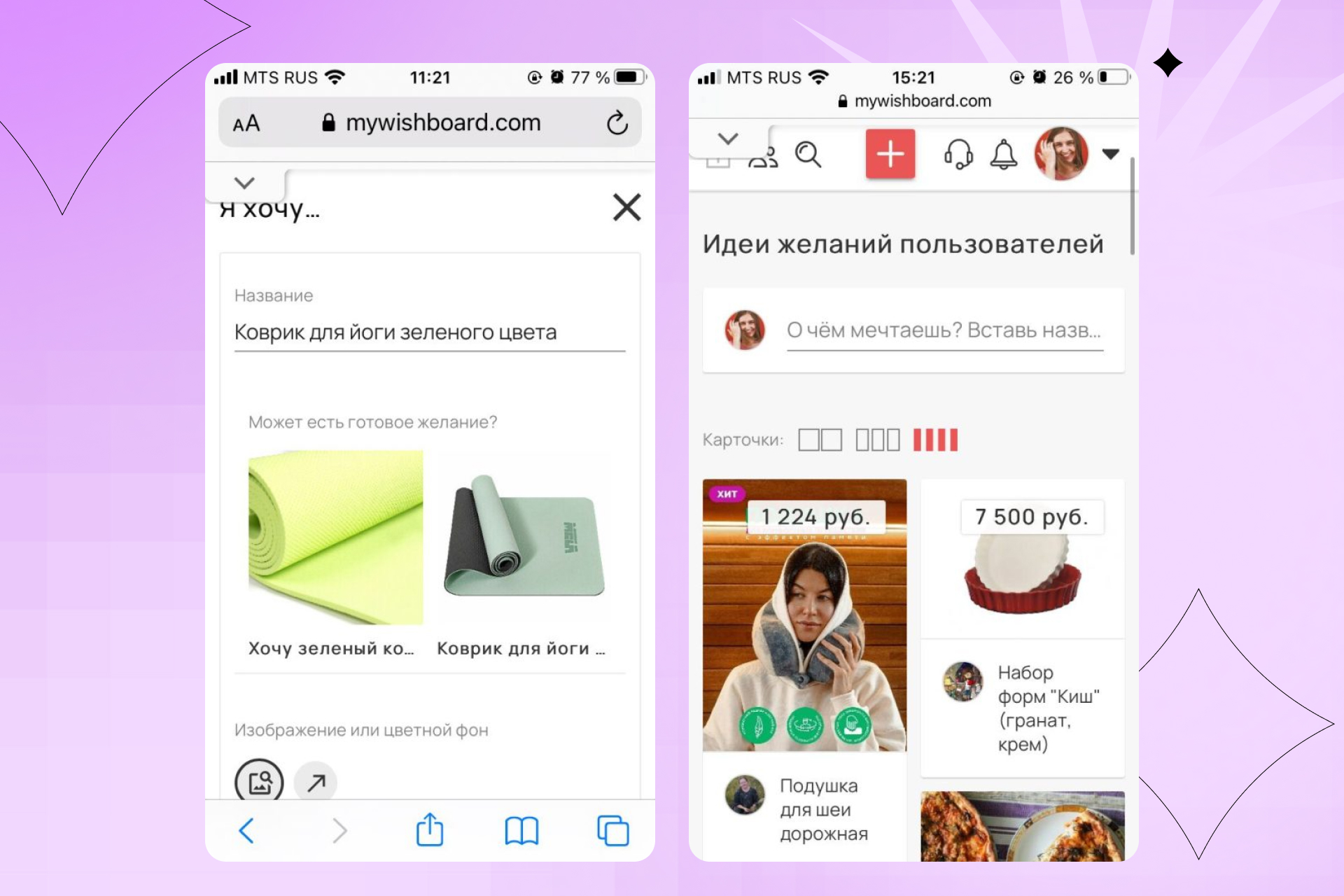 Удобно, что при создании карточки желания сайт автоматически подбирает похожие из базы. Например, если вбить название «зелёный коврик для йоги», сервис предложит уже готовые товары, которые можно быстро занести в список.