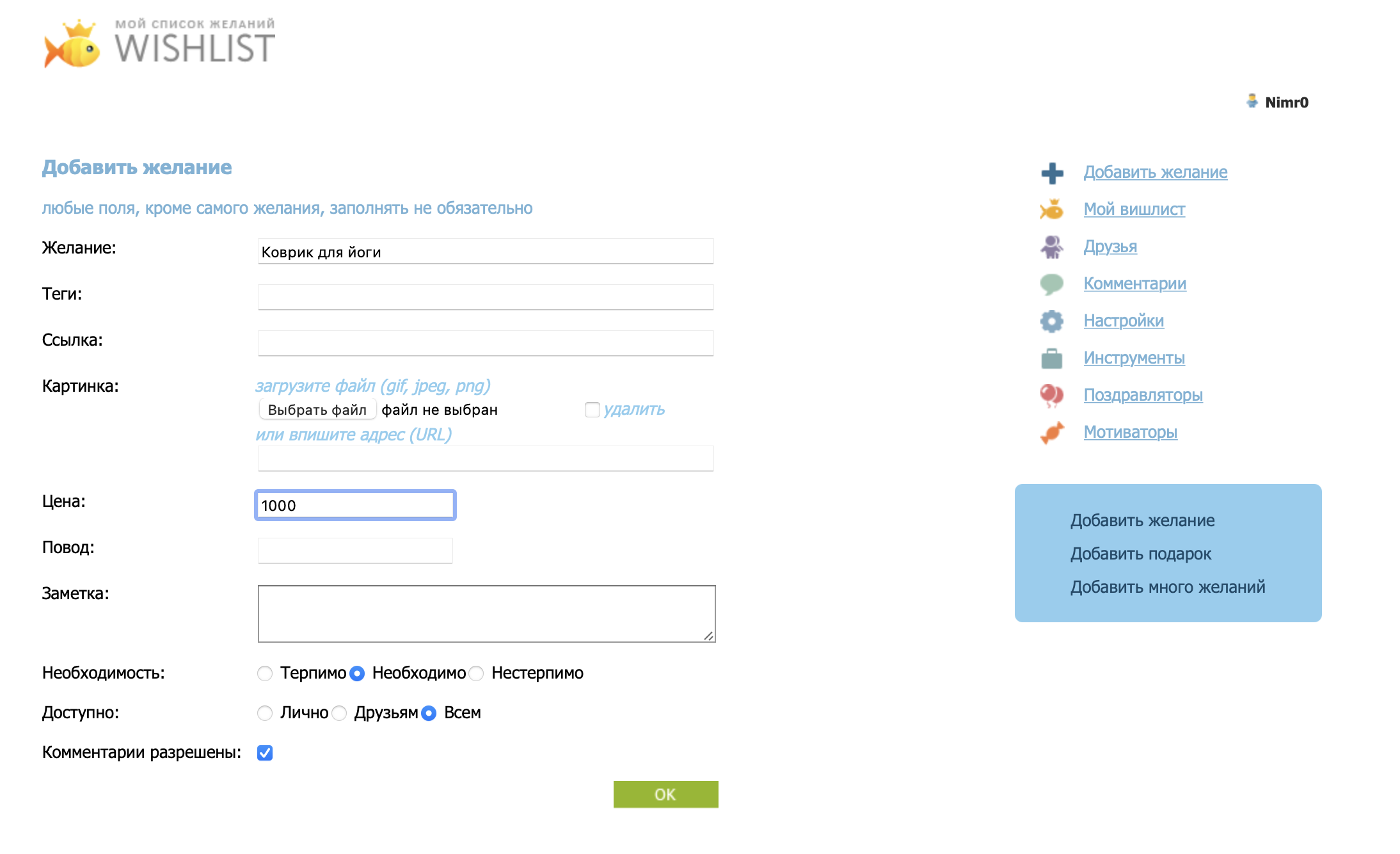 Вбивать желания самостоятельно очень удобно: приложение автоматически подгружает описание и фотографию по прикреплённой ссылке.