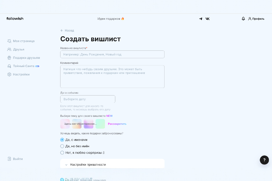 Followish даёт возможность выбора — хотите ли вы видеть, какие подарки забронировали. Причём можно указать, чтобы был виден сам факт брони или также отображалось имя дарителя. Карточка подарка обычная: можно указать название, ссылку на товар, приложить фото и добавить комментарий объёмом до 280 знаков.